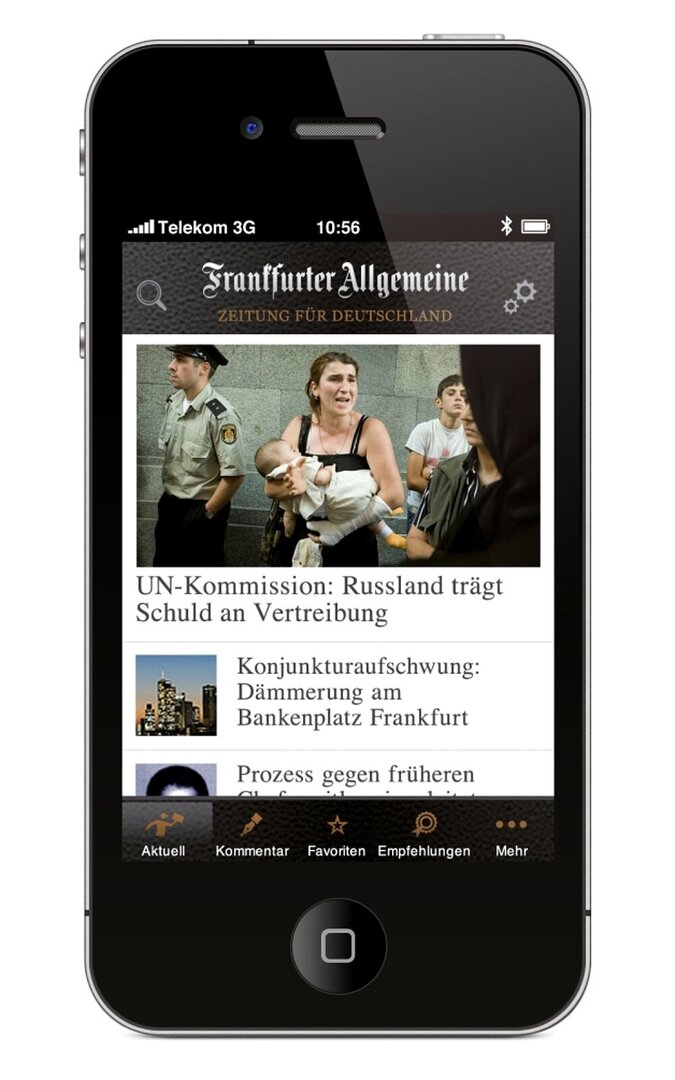 The outstanding quality of the Frankfurter Allgemeine newspaper’s journalistic oeuvre was the main focus in the development of the F.A.Z. iPhone app. 15 sections offer the user current news, interesting articles, in-depth commentary, image galleries as well as daily videos. On a weekly basis, the editors of the arts supplement present their exclusive recommendations on literature, non-fiction books, film, theatre, cuisine, music, cartoons and exhibitions. A personalised starting page and social media connectivity are additional, user-friendly features.