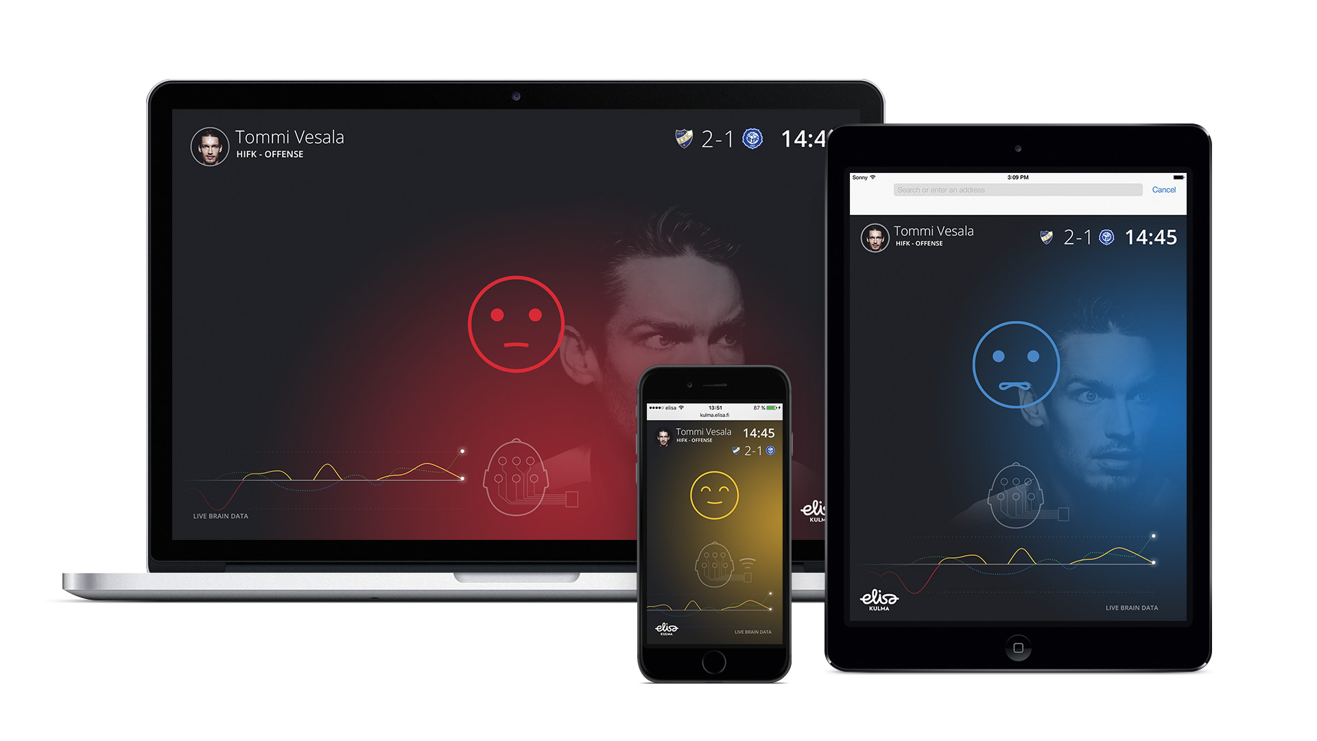 With this app, football fans can follow the player’s emotions during a match. To achieve this, a wearable EEG scanner, which is able to send data on the player’s brainwaves to a computer in real time, was created. Algorithms were developed to translate the EEG signals into four different states of mind: flow, go, stop and effort. The app visualises each state of mind with a colour corresponding to the mood and an emoji. The app was launched at a derby between the Helsinki teams HIFK and HJK, starring HIFK defender Tommi Vesala, who was wired with the EEG scanner.