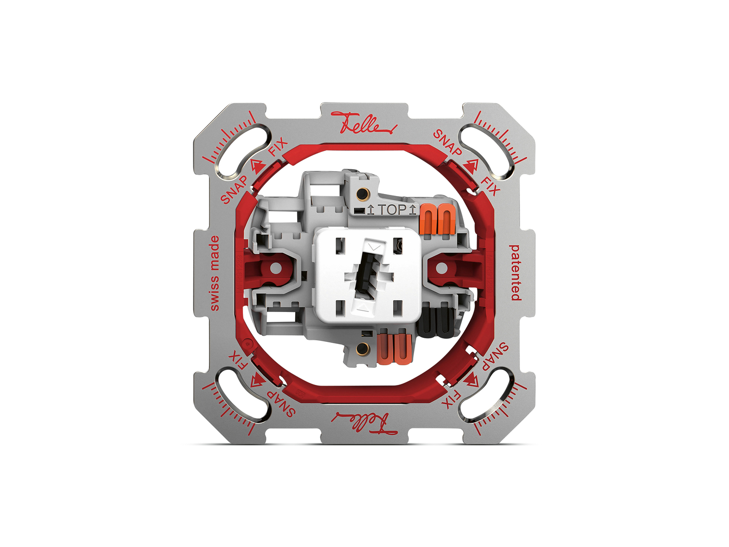 The Feller SNAPFIX modular mounting system facilitates the installation of switches and sockets. An innovative red adapter enables easy removal and replacement that functions, such as switches and socket outlets, can be easily removed and replaced from the front of the wall and also gives the system a high recognition value. Thanks to the symmetrical internal cut-out, nine different mounting plates are sufficient to fulfil a wide range of installation requirements. The system thereby reduces errors and saves time and money. Helpful pictograms support correct installation.