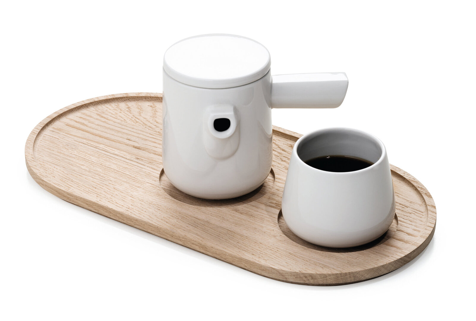The pieces of this coffee set were inspired by Japanese tea ceremonies. Designed especially for the use in a professional setting, the pot can be combined with one of the three available cups for individual coffee servings. The coffee pot is easy to clean and suitable for professional espresso machines, while the characteristic cups enhance the coffee aroma experience. Thanks to their round shape, the cups fit snugly in the hand, allowing users to swirl their coffee in the cup.