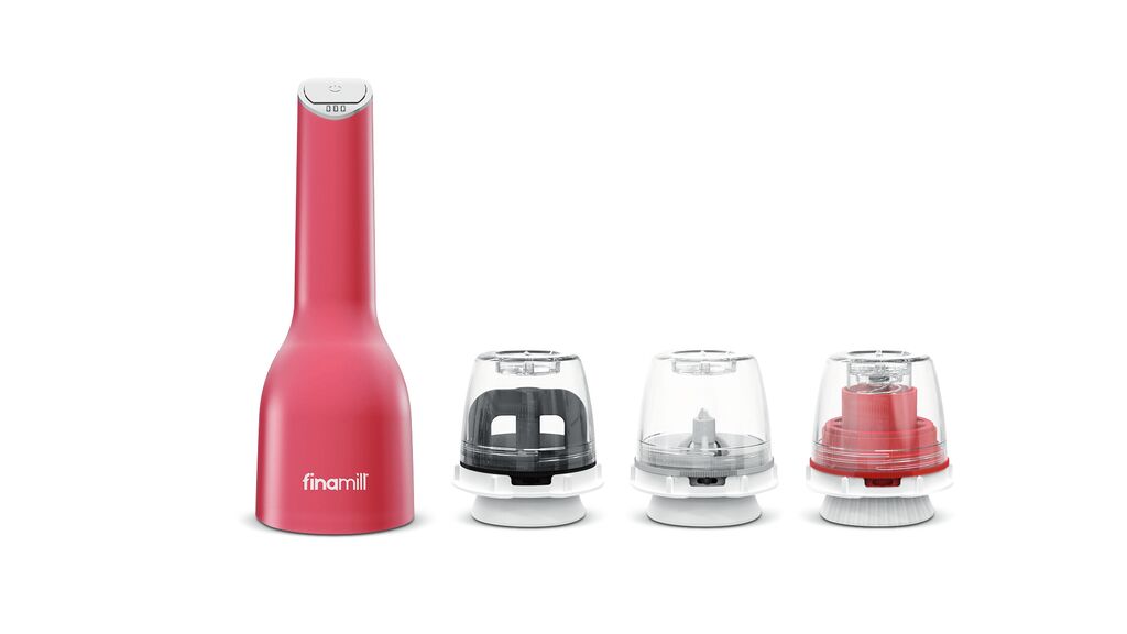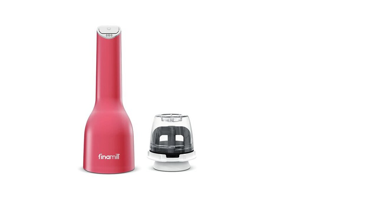 FinaMill is the expression of an innovative concept – the rechargeable spice mill. It is based on a series of easily interchangeable pods, which also serve as containers for the spices, to keep them fresh. Simply place the base over the respective pod, push it down into place and start grinding at the touch of a button. The mill makes light work of whole spices, from mustard seeds to 5 cm-long cinnamon sticks.