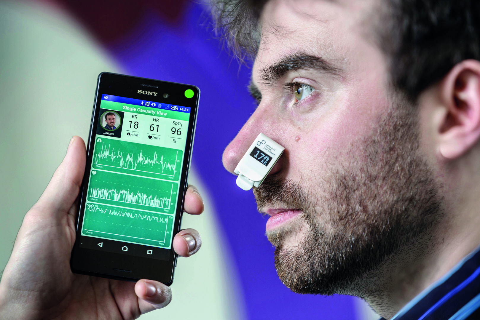 First Response Monitor is a small device that clips onto a patient’s nose to monitor breathing rate and heart rate, giving an at-a-glance indication of both parameters. This data is added to a trends graph that shows how these measurements change over time. The data can be transmitted via Bluetooth low energy to a smartphone application or tablet, enabling further analyses such as multiple patient triage or situational awareness across the group. Traditional medical monitoring for patients relies on large and expensive equipment, usually located in ambulances or hospitals, but there isn’t anything on the market that provides a portable, easy-to-use and low-cost monitor for first responders. For the military, which was the initial market researched, first responders tend to be normal soldiers, not experienced medics, so ideal solutions need to be easy-to-use and intuitive – and any equipment has to fit inside their backpacks. Similarly, for a civilian first aid scenario, equipment has to be low cost, easy-to-use and disposable to be part of a first aid kit. The team undertook user research with a large group of combat medics, paramedics, doctors and logistics teams to identify the most important elements in a first responder situation and uncover needs that had yet to be considered. For example, checking breathing or heart rate is done manually, which is laborious and challenging amidst the noise and stress of a disaster or the front line. It is also difficult to provide adequate care for multiple casualties in these scenarios, when one medic will typically have to attend to a number of injured people. The team also researched the critical parameters for monitoring patients in the “golden hour” – the period following a traumatic injury, during which prompt medical treatment has the highest chance of preventing death. All the research had enabled the designers to refine and miniaturise the design significantly and provide a truly groundbreaking solution by incorporating novel technology.