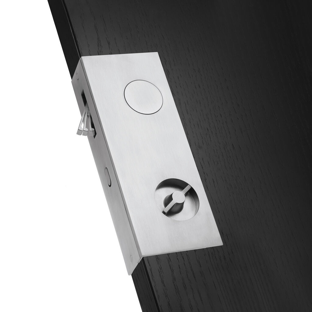 Flat is an innovative sliding door handle. Both the closing and opening mechanisms are integrated into a plate, which extends around three sides of the door. The opening and sliding functions are accessed by pressing a disc on the upper section of the plate. The locking mechanism is situated in the lower section and is activated by turning a knob.