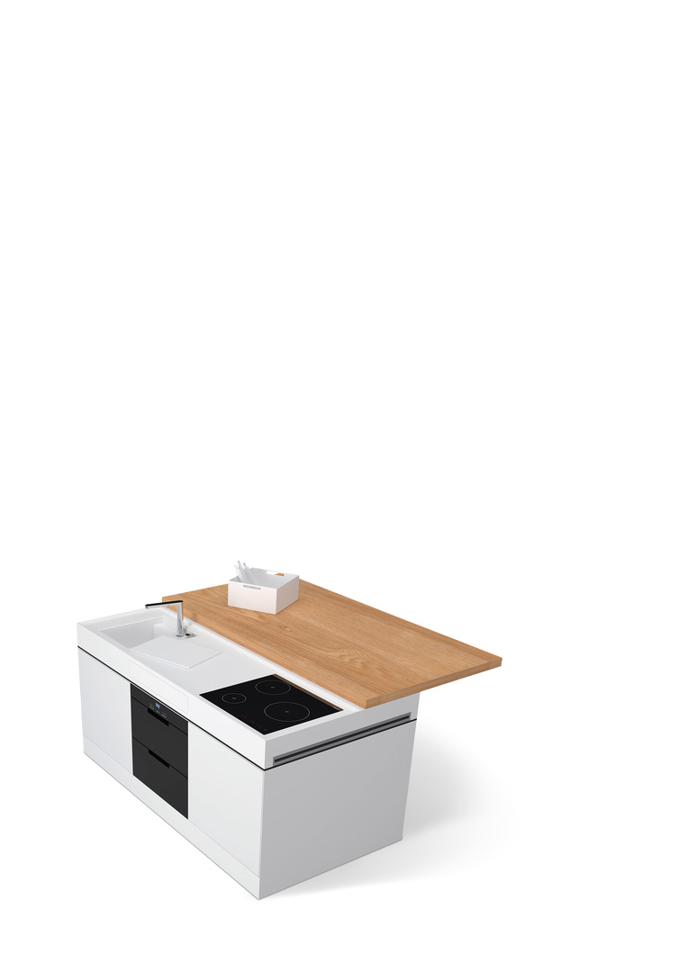 With its complex design, Flex enables multi-functional use in the smallest space. For cooking, the table cover is pushed aside and the kitchen tap is taken out so that the cooking area is ready for use. When there is no cooking to be done, the table cover is on top and the kitchen cabinet turns into a decorative table. The design of the unit base is not only convenient and functional but also plain and space-saving.
