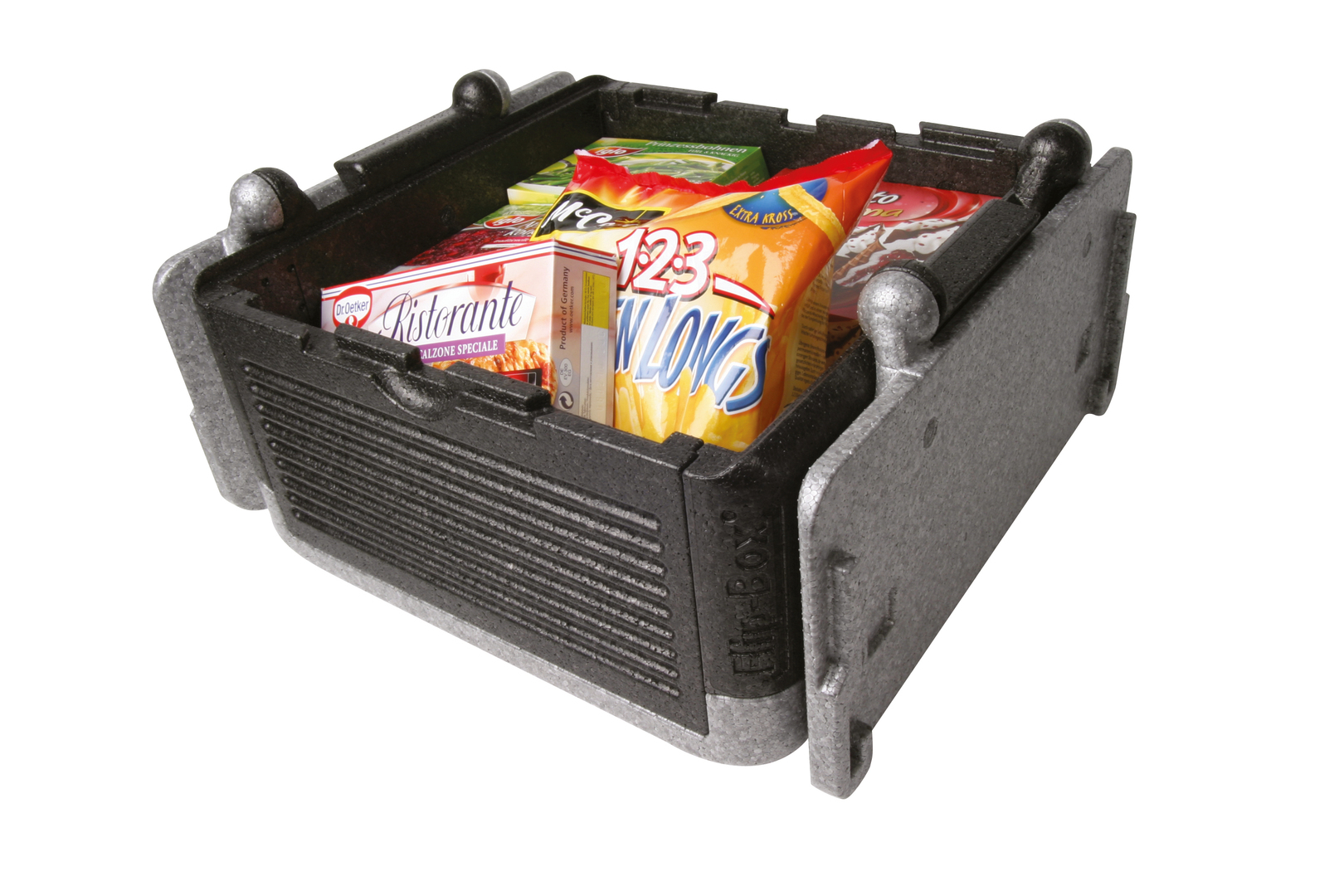 The innovative foldable box, made of recyclable plastics, offers the advantages of a multifunctional insulation and transport container for temperature-sensitive goods like frozen or fresh products. The square base design of the lightweight box ensures both easy handling and a volume reduction of 60 per cent when transported empty. External hinges, the rounded lines of the outer surface and a striking two-tone look give this box its distinctive character.