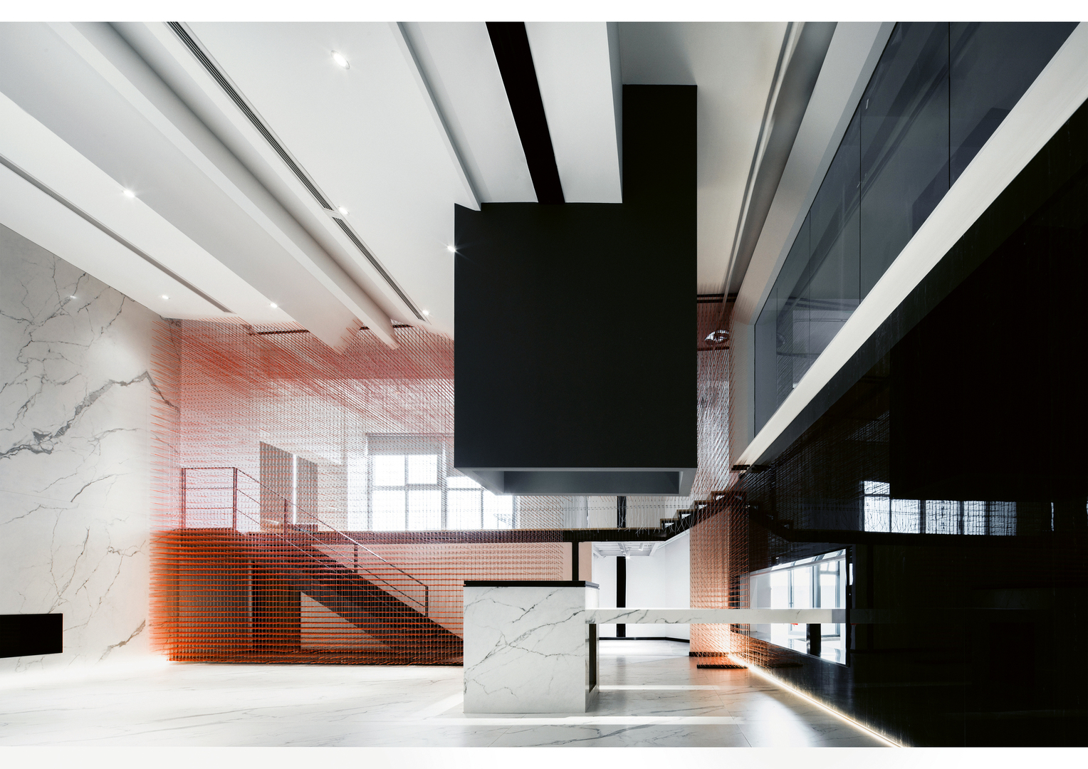 This flagship store of a ceramic tile exporter is divided into various zones. The concave and convex construction modelling of the hall greets visitors with a representation of the material composition of ceramic tiles. Passing through a stone sculpture area, one then reaches the slate area. This is the heart of the entire exhibition hall and serves as a meeting room. It is kept in black-and-white to highlight the character of the brand. It is complemented by a partition wall in a dynamic shade of orange.