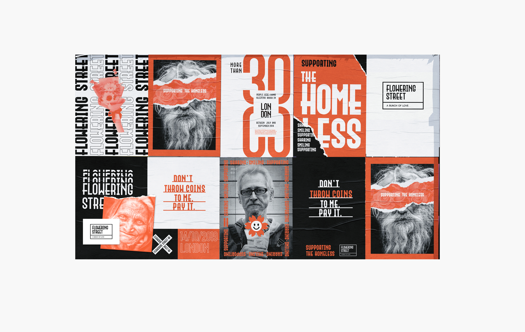 To help homeless people in London, this charity project promotes the idea that the homeless earn money themselves by selling flowers in the streets. The brand logo is inspired by street signs of London, recalling the issue of people sleeping rough, while the slender, elongated font references the shape of flowers. A bolder version of the same font is used on posters, paired with emotionally appealing portraits and the brand’s main colour orange. Considering the dreary experiences many homeless have had, the design employs a less saturated shade of orange, which spreads a slightly subdued mood.