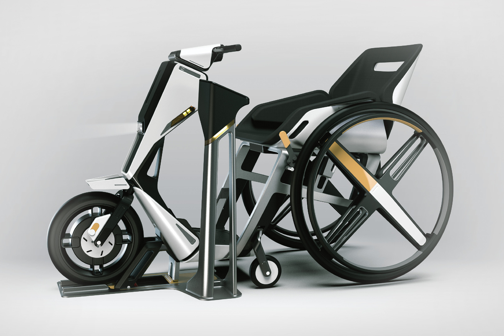 Fluid enables wheelchair users to move more quickly and easily. It incorporates a sharing system by redesigning existing products, allowing users to assemble their handbikes with personal or public rental platforms to travel wherever they want. It is also compatible with public transportation, thus giving access to more transportation options. When moving into an indoor space, Fluid only needs to be parked near public rental platforms for storage and recharging. Assembling this wheelchair-accessible handbike is as simple as pushing the wheelchair forward into the handbike. The wheelchair’s structure and layout were redesigned to ensure safe operation. This includes the addition of a rear turn signal to indicate the direction the wheelchair is travelling, wheel hub brakes for more immediate deceleration, and the use of wheels with inclined angles to reduce the risk of tripping and overturning.