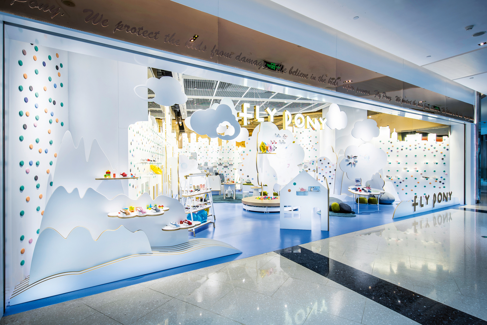 Expressing the core message points of “protection, magic, French style, encouragement, and education” by the French shoe brand Fly Pony, this con-cept for the company’s flagship store stages a vivacious “Kids dream world” featuring eight colours. In addition, gold is used to visualise the strong courage, passion and innocence of children, while coloured magnetic dots convey that the display of shoes could be as “free as magic”. All white surfaces can serve as writing boards, inviting children during POP activities to draw graffiti.