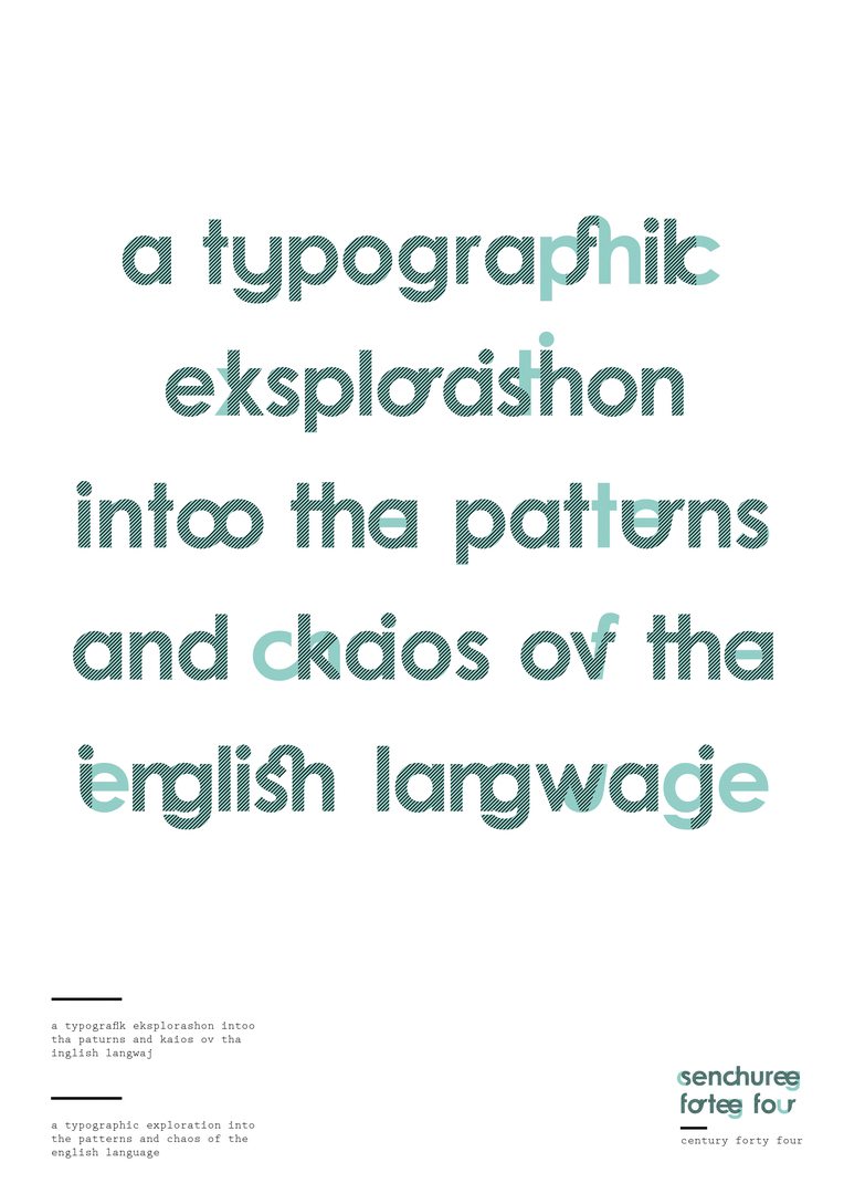 Recent studies show that 20 per cent of New Zealand adults do not have the literacy skills to meet the demands of everyday life. A contributing factor to this is the complex- ities and irregularities in letter and sound relationships within the English language. The project foanetiks is a typographic exploration into the chaos and the patterns of the English language. Its idea is to translate between English and phonetic spelling and to bridge this gap by helping learners to recognise correct pronunciation represented by inconsistent spelling. The single letters were modified in a way that readers may receive the required help for the requested pronunciation on the one hand and recognise the correct spelling on the other, as the modification is coloured slightly differently. The layout of this typographical work comes in a reduced and tidy design helping readers to overcome their difficulties step by step.