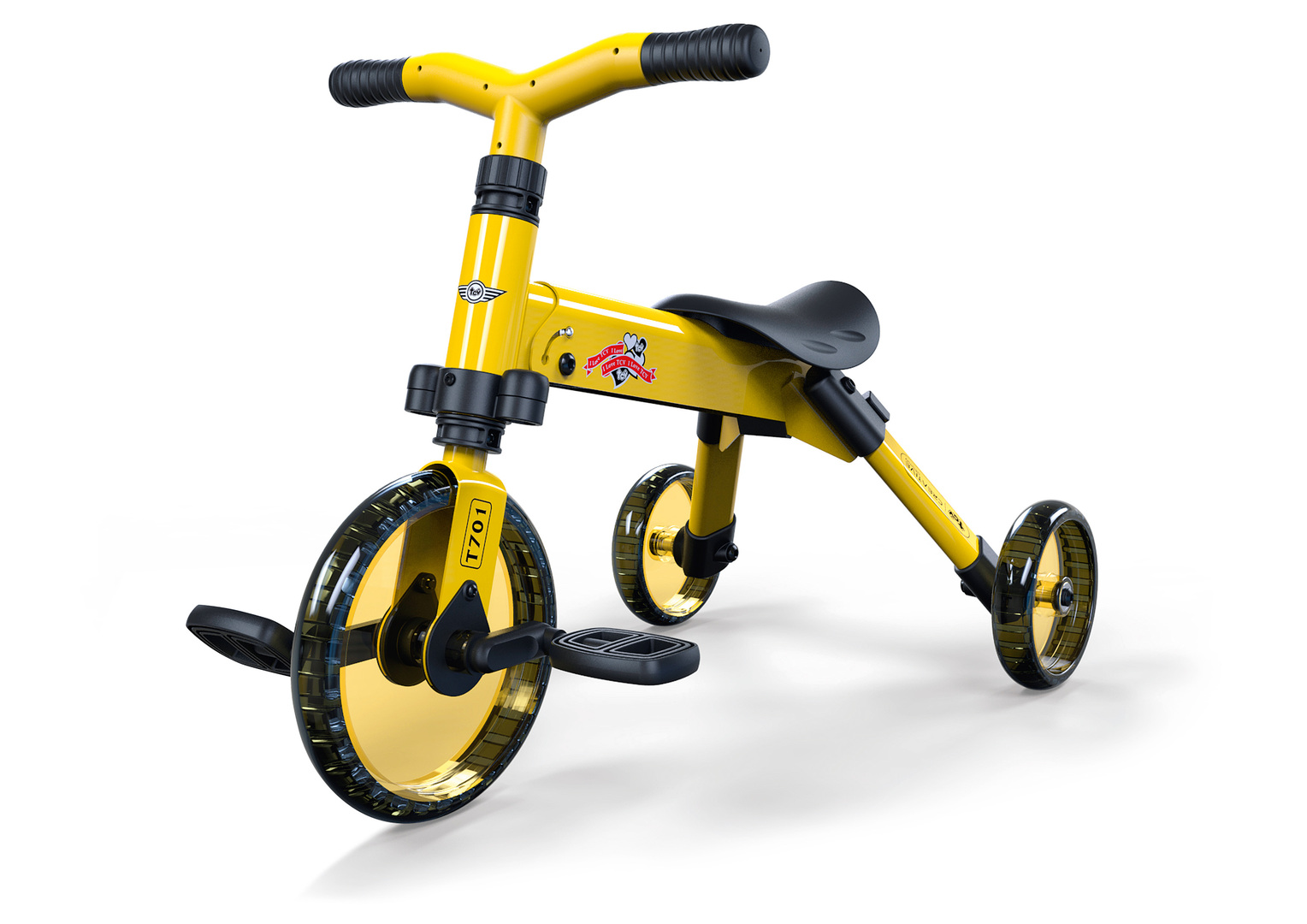 This product trains the attention, balance and coordination of children from three to five years old. In integrating multiple functions, it can serve as a balance bike, running bike or tricycle, according to the development of the child. The patented pedal design allows the balance bike to be converted into a tricycle in just a few seconds. Thanks to a folding mechanism, the bike is compact and easy to transport, for instance in a car.