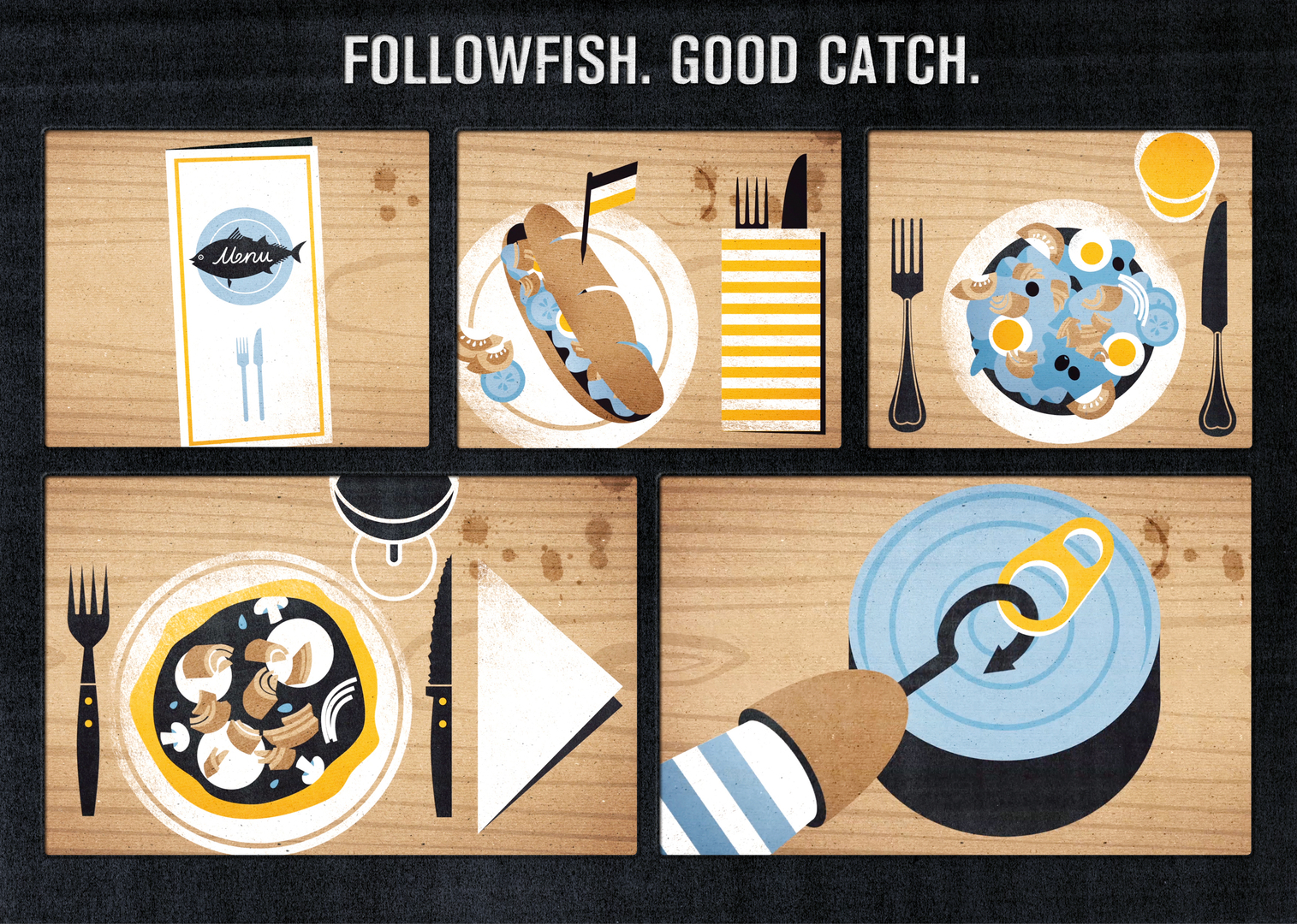 by the tuna industry and compares them to the sustainable technique used on the Maldive Islands. That is where Followfish support both the century-old, simple method of catching fish by hand and the further processing of the products on site, thus contributing to the protection of the local economy and the stocks of those fish. The message that tuna is delicious, particularly so when knowing how it was caught, is conveyed in a fresh and distinctive approach.