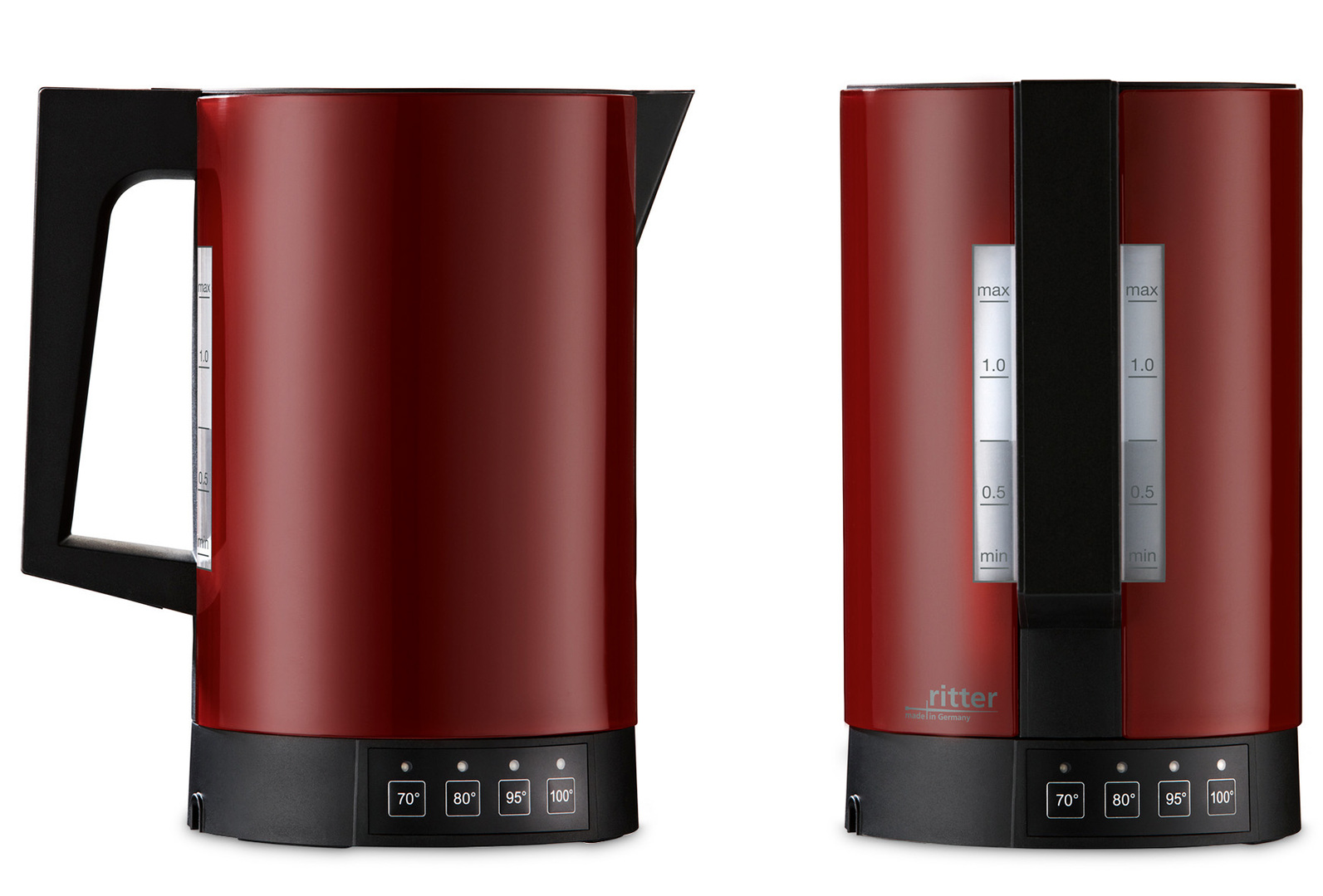 The fontana 5 kettle aims at a symbiosis of zeitgeist and elements of the Bauhaus style. The cordless kettle with a 360-degree rotating base station has a heat insulated external housing made of high-grade acrylic glass and comes in black, white or red. A water level viewing window on both sides indicates the filling quantity. The water temperature can be set precisely and is shown on a LED display.