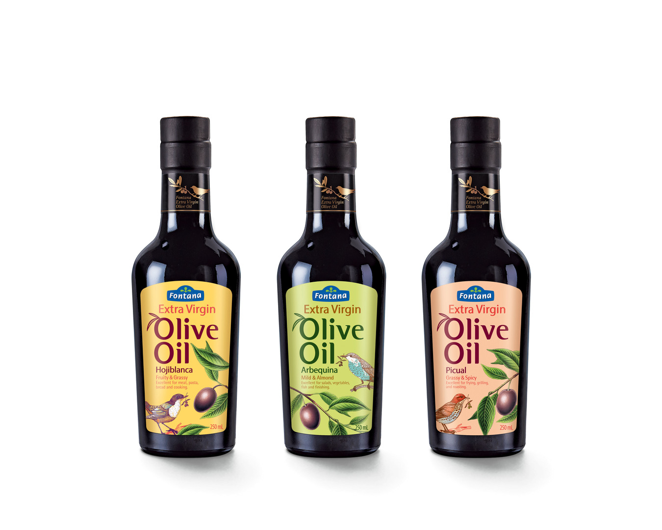 Fontana’s Extra Virgin Olive Oil is made from select olives from Spain. The packaging design underscores the premium quality of the brand and uses nature-related visual language. The illustration of a lark, famous for its beautiful singing, and an olive twig bathed in sunlight convey an emotionally appealing brand message. The label features a special colour and a slightly different motif for each flavour, helping consumers to differentiate between the three oil types.
