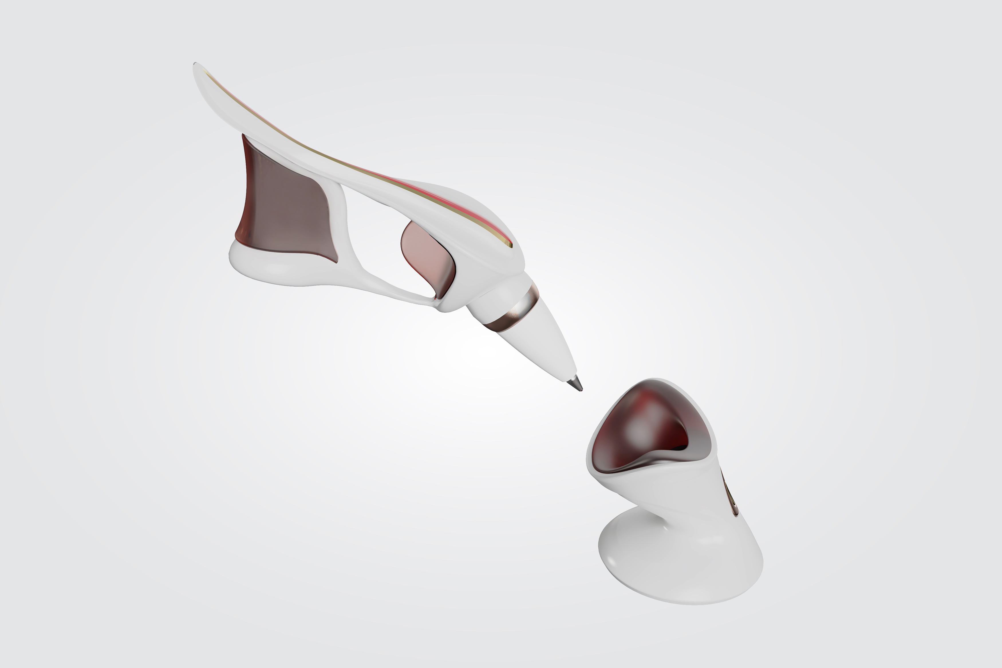 Footwriter is a writing tool designed for individuals without hands that provides a natural and comfortable foot position for writing. The meticulously designed pen shape maintains a clear line of sight while writing, and the high-quality silicone grip reduces friction-induced discomfort. Additionally, the pen cap is oriented at a 45-degree angle with a magnetic attachment to provide easy access. Red Dot Award: Design Concept | Concept | Education and Learning