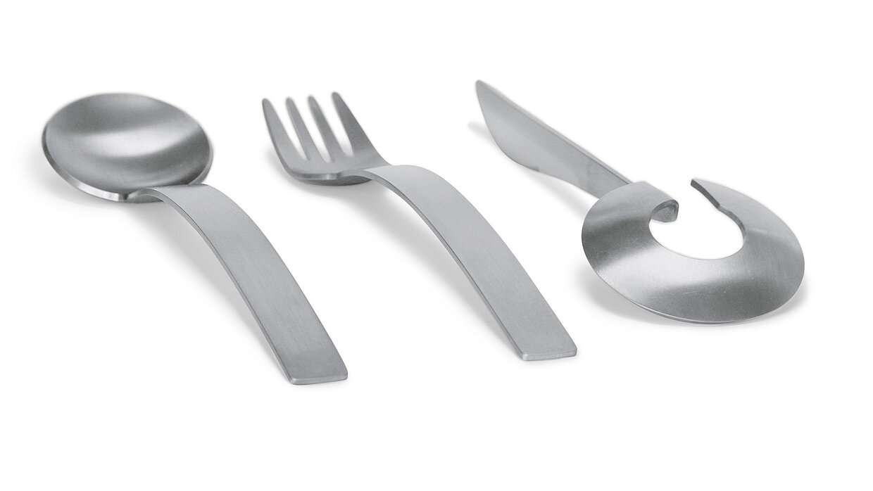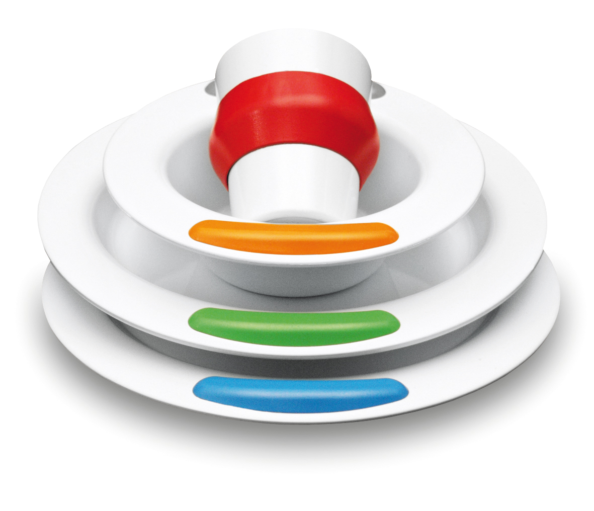 This children’s tableware set consists of a bowl, a soup plate and a flat plate, a beaker, a beaker sleeve and six handle grips and is specially attuned to children’s motor skills and strength. The handle grips and the beaker sleeve provide stability; the non-slip ring assures secure standing. The unbreakable set is made of recyclable melamine. It is available in white and also with coloured decorations.