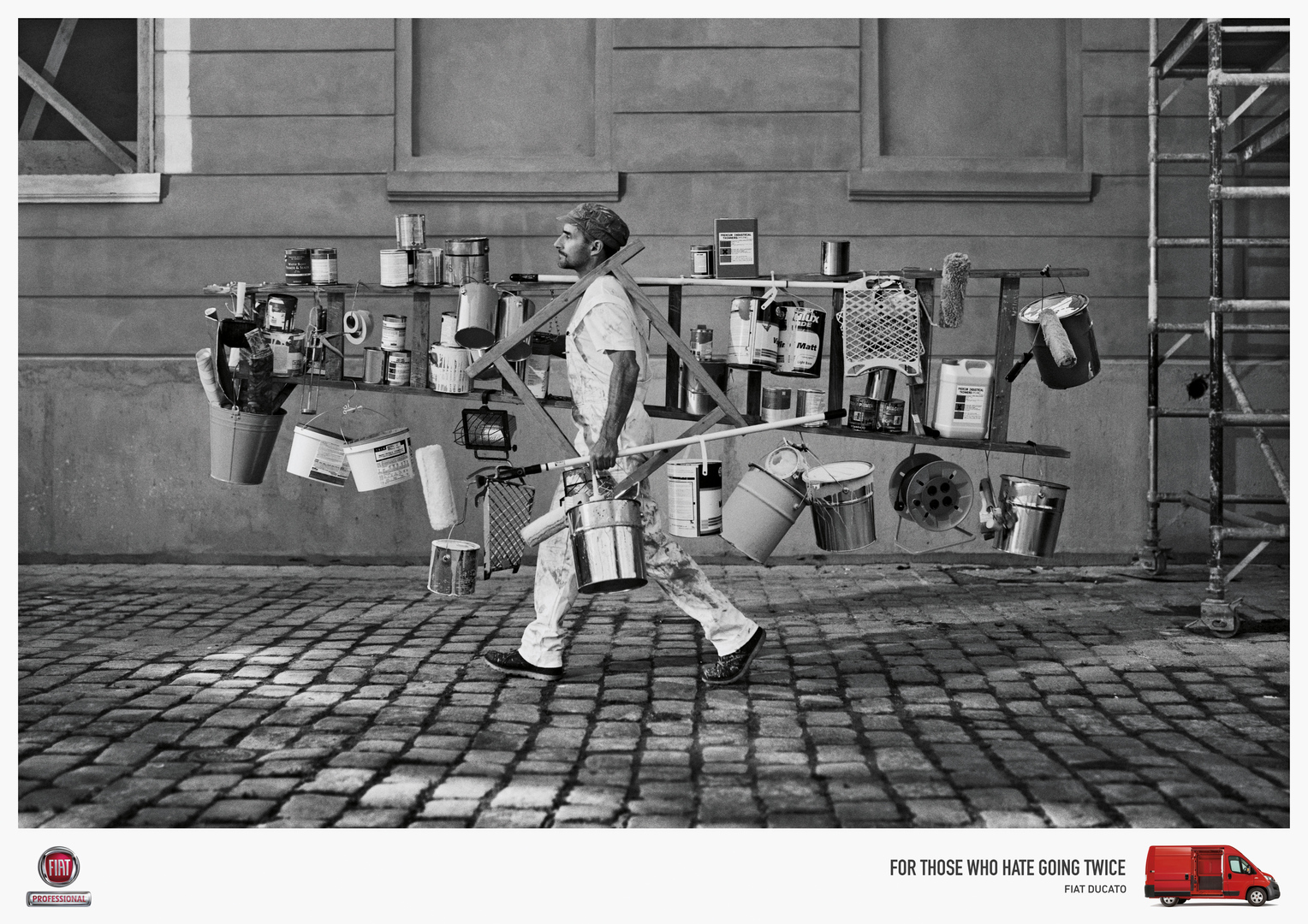 This print campaign for the Fiat Ducato is inspired by the phenomenon that people, when they have to bring many items from one place to another, rather carry everything at once instead of going twice. That is particularly true for the clients of this brand, including craftsmen, construction workers and small business owners. The image motifs depict people who stack their tools and wares in an almost artistic way to transport them. This series of ads thus demonstrates the load capacity of the commercial vehicle in a surprising and memorable manner.
