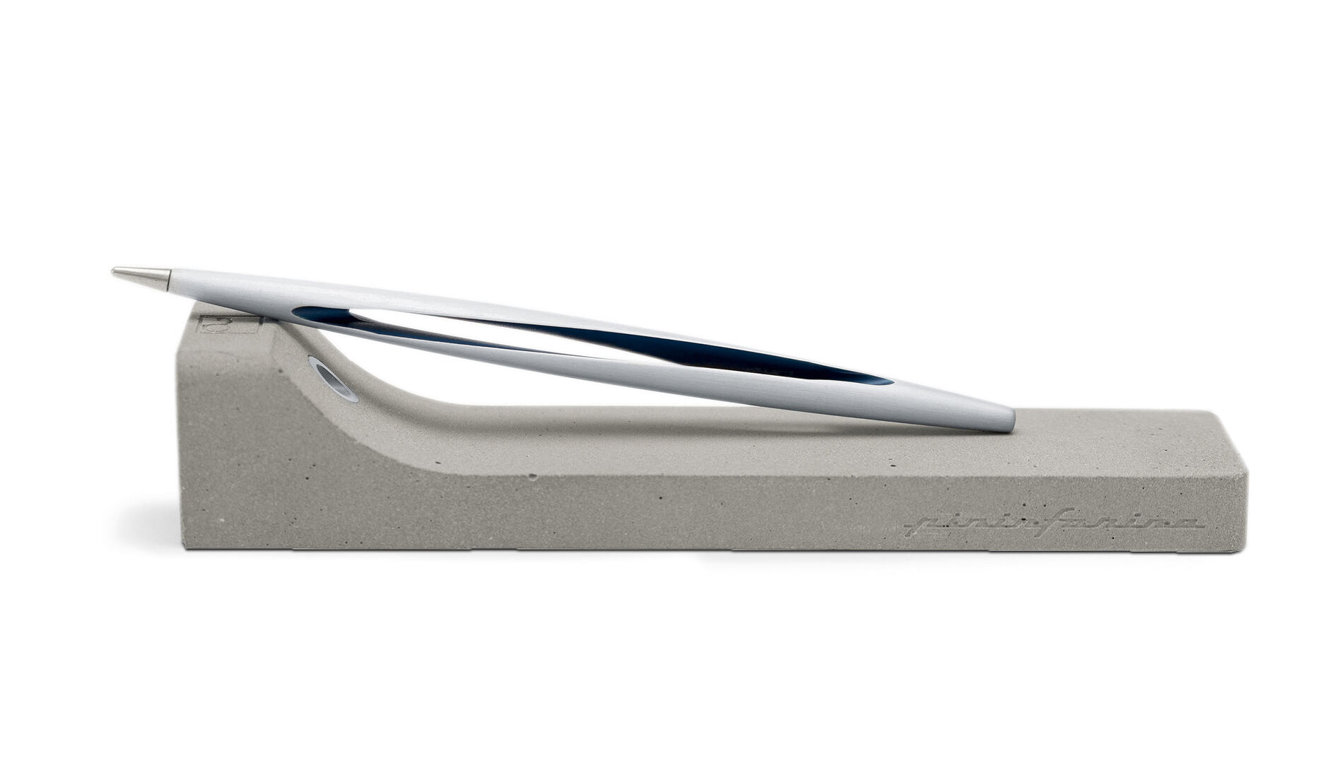 The special feature of the Forever Pininfarina Aero stylus is its tip. Made of Ethergraph, a special metal alloy, it allows writing without ink. The pen itself is made of the aluminium alloy Ergal. Its appearance is defined by the empty core of its body, which is encompassed by a filigree, slightly twisted frame. This design is inspired by the symbol for eternity. The pen is complemented by a concrete base, which forms a deliberate contrast to its delicate form.