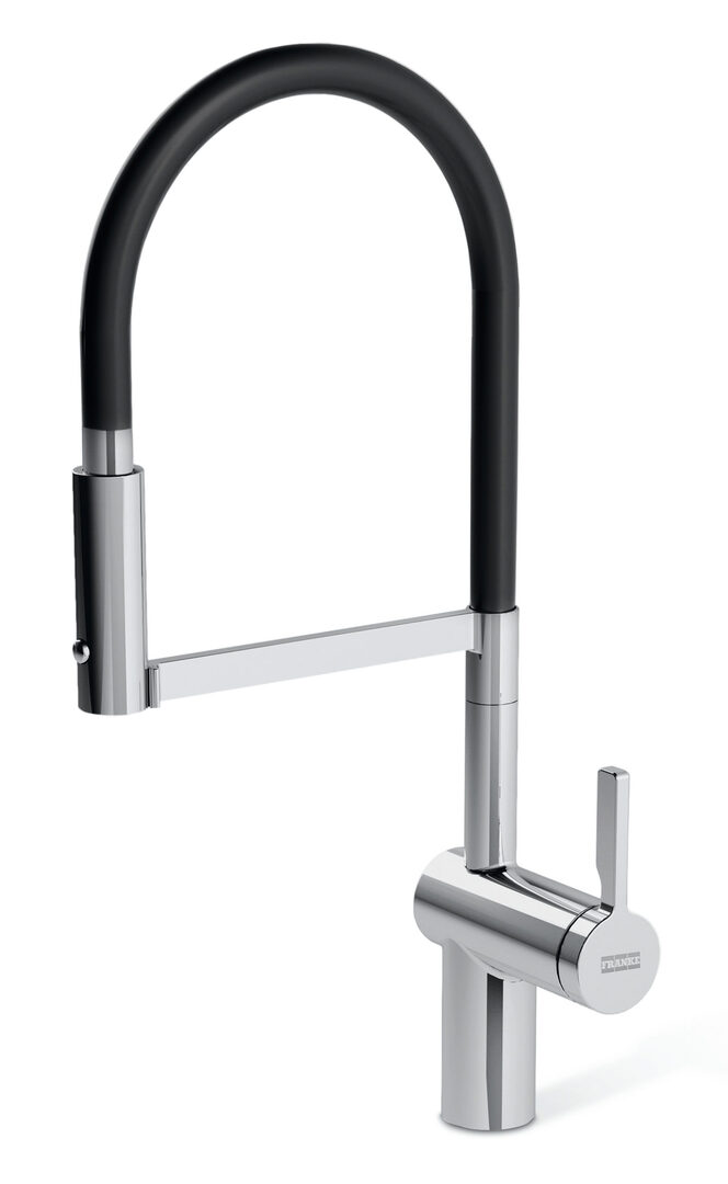 At first glance, the high degree of flexibility of this semi-professional tap with swivel spray head from the “Frames by Franke” series is not recognisable. Thanks to the magnetic holder, the spray head is quickly grasped. The so-called Highflex hose is both stable in form and flexible. Thus, the spray head always stays in position and does not drop into the sink. The water jet from the spray head can be adjusted as required. The tap is available in a chrome and a stainless steel version.