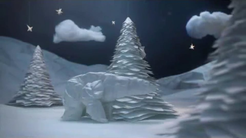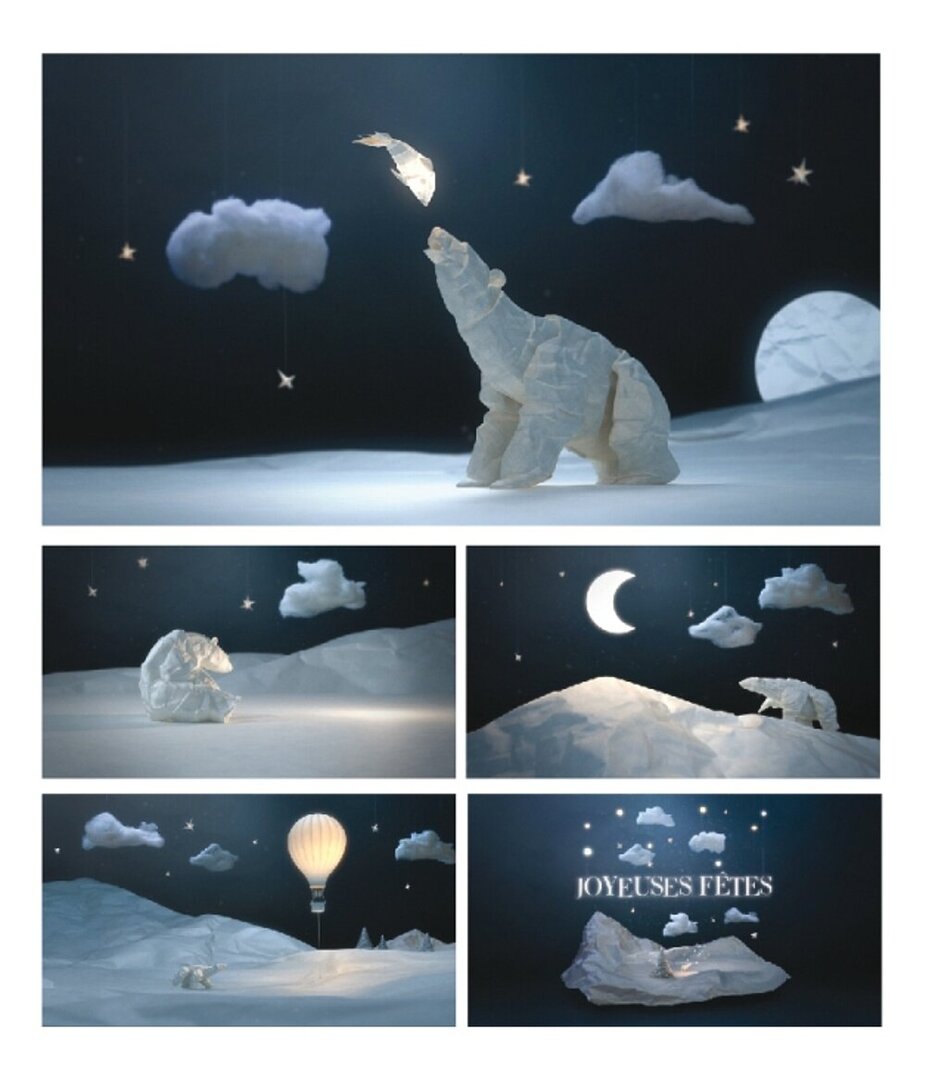 How can you get a TV audience into the Christmas holiday spirit without resorting to long-established clichés? The objective for this spot was to develop a Christmas branding for the public service channel France 3; a branding that would appeal to the different age groups of an ever-changing society and one that would not be religious. Crumpled paper, paper folded in Origami style and small cotton clouds were used to create a little world with a poetic winter landscape appeal, which, almost casually, also raises awareness of global warming. In this white landscape, a polar bear enjoys its life experiencing many different little stories or incidents. Thus, from the top of a mountain, the bear can give the moon a little push to make it swing, or it catches a shining fish, which, as soon as it has been swallowed, makes the bear shine from the inside. Hundreds of hours of 3D animation were necessary to create these lifelike renderings that aim to accompany the audience through the winter in a charm- ing and enchanting way. Statement by the jury »This elaborately designed, yet not overloaded presentation has a very charming appeal. It succeeds in addressing the audience not only beyond the typical clichés of the Christmas season, but also across all ages, genders and religious beliefs, and thus creates a custom-tailored solution for the channel.«