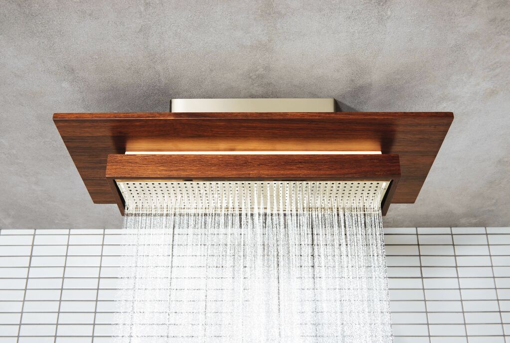 The design of this showerhead in the tradition of Frank Lloyd Wright designs skillfully creates a compelling aesthetic that stages showering in an exciting manner.