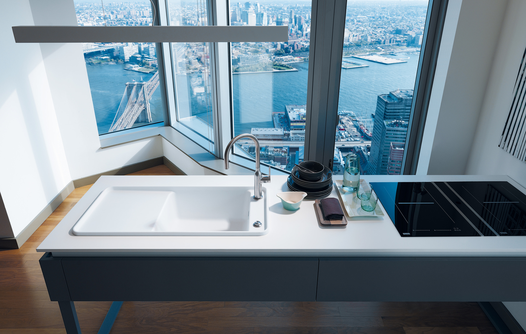 The elegant appearance of the sink Style is created by the use of Fragranite material in a shimmering shade of alabaster combined with soft radii and slim proportions. The large sink with integrated drain cover is extremely convenient and is separated from the dry zone by an eye-catching edge. Among the accessories are a wooden cutting board and a tray which can both be placed on top of the sink.