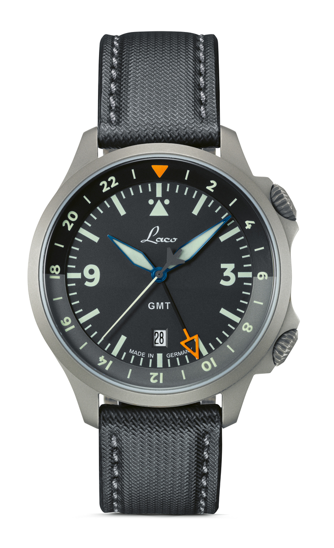 This pilot’s watch has a sandblasted stainless steel case, which is waterproof up to 20 atm. The dial is protected by double-domed anti-reflective sapphire crystal. In order to display the time reliably in the dark, the essential dial details such as hour and minute hand have a luminous coating. A second time zone is indicated by the 24-hour hand and the internal rotating bezel, which has a ball bearing and can be adjusted using the second crown. The calibre Laco 93 with automatic winding mechanism ensures special accuracy.