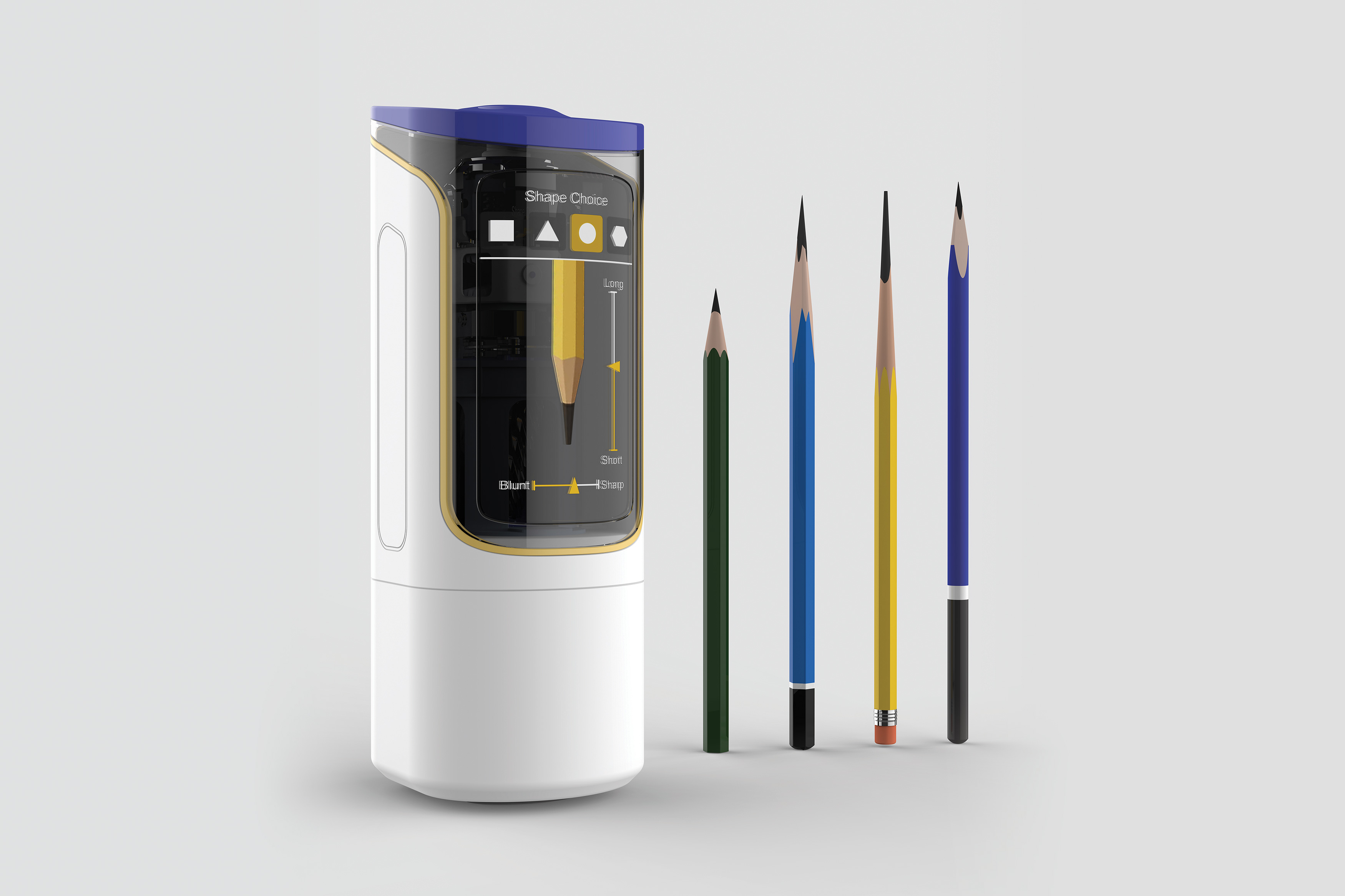 FREEDOM SHARPENER allows users to customise the shape, length, and sharpness of pencil tips via an interactive screen. Simple operations and real-time simulations ensure efficient sharpening without safety concerns, enabling users to configure settings and verify the tip before inserting the pencil. The sharpener retracts the pencil automatically, remembers preferred styles, and uses precise mechanics and programmed control for quick, effortless sharpening.