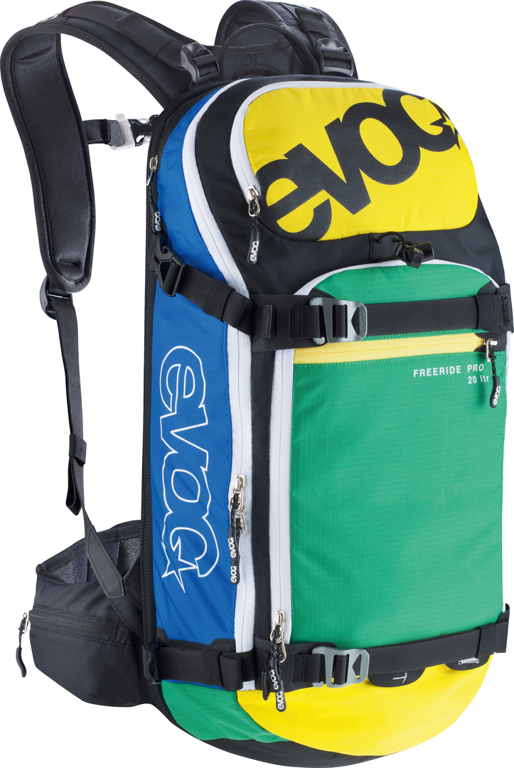 The Freeride Pro 20L daypack was developed for freeriders and freeskiers, featuring a variety of storage compartments, attachment possibilities, as well as an integrated back protector that can also be detached and used separately. The design concept focuses on important functions required for use on mountains: ergonomic neoprene shoulder straps and a wide hip-belt with Velcro and buckle fastenings ensure high wearing comfort, while a signalling whistle and a quickly accessible avalanche compartment allow users to react expeditiously in case of emergency.