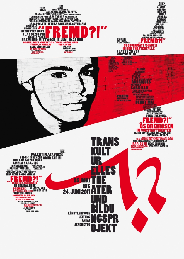 The poster conveys the transcultural character of the educational theatre project “Fremd?!” (“Stranger?!”) by and for adolescents and young adults mainly by using typographical elements. The diversity of modern society and the cultural backgrounds of the participants were highlighted by arranging the names of the participants into the shape of continents. The design directly addresses the different target groups of the event, teenagers as well as their families, and also the urban population that has an interest in the topic.