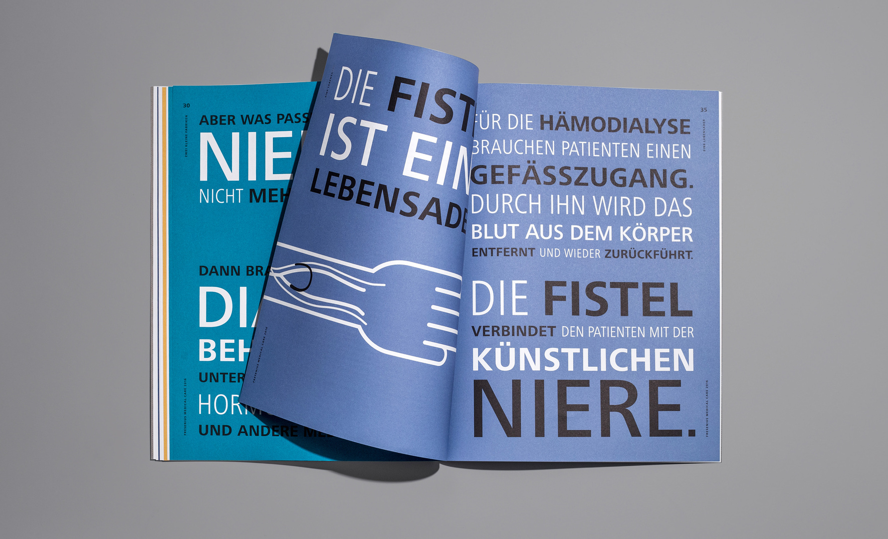 The annual report of the provider of dialysis products and services is entitled “Applying Knowledge” and illustrates the approach of taking responsibility and sharing knowledge with patients, staff and partners in the health system. In the corresponding magazine “Wissen Leben” (living knowledge), the growth strategy is presented as an emotional experience. The book-in-book publication is intended to be regarded as an independent corporate magazine. For the 20th anniversary, lightening motifs were created, which link the company’s sales figures on the pages dividing the chapters to the theme of knowledge.