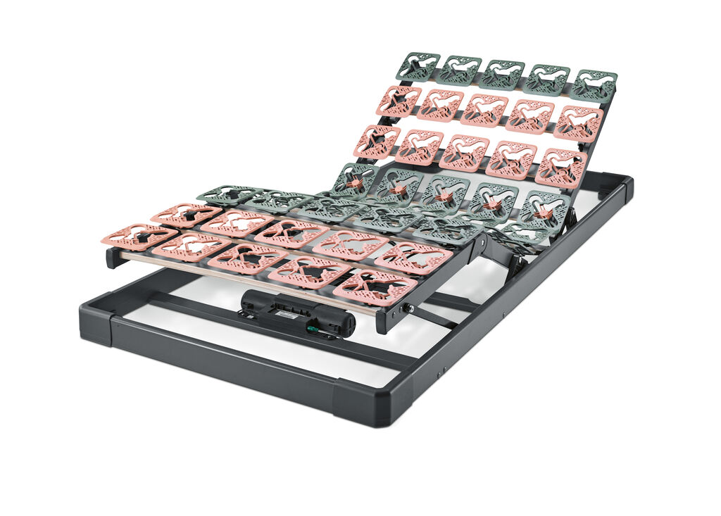 The development of the Froli Dream slatted frame was inspired by technologies found in the automotive sector’s recreational vehicles. Although it is only 8 cm high, the flat spring system as well as an integrated shoulder comfort zone and lumbar support ensure the frame is extremely comfortable to lie on. At the same time, Froli Dream offers high stability under lateral loads and flexibility under vertical impact. Varying degrees of hardness and an innovative clip system for individual pressure compensation furthermore allow users to adapt the frame to their personal needs.