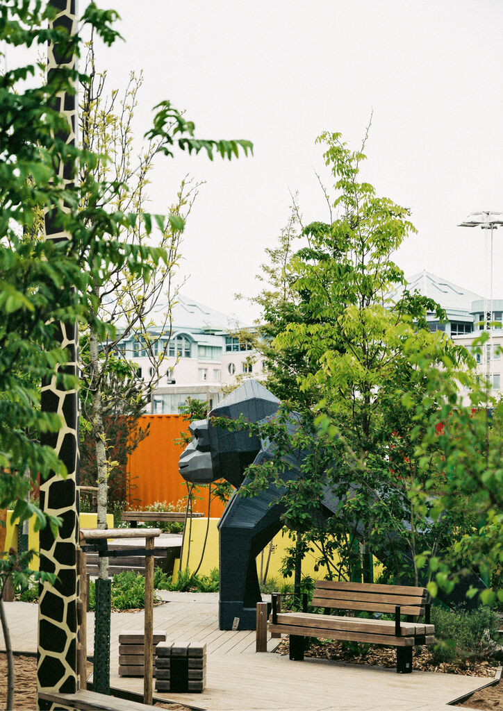 This playground, located on a former dry dock, also makes good use of sound design. A protective wall made of containers keeps out traffic noise, and a loudspeaker system makes it possible to play various sounds at different points. These include creative sound installations, like an interactive gorilla.
