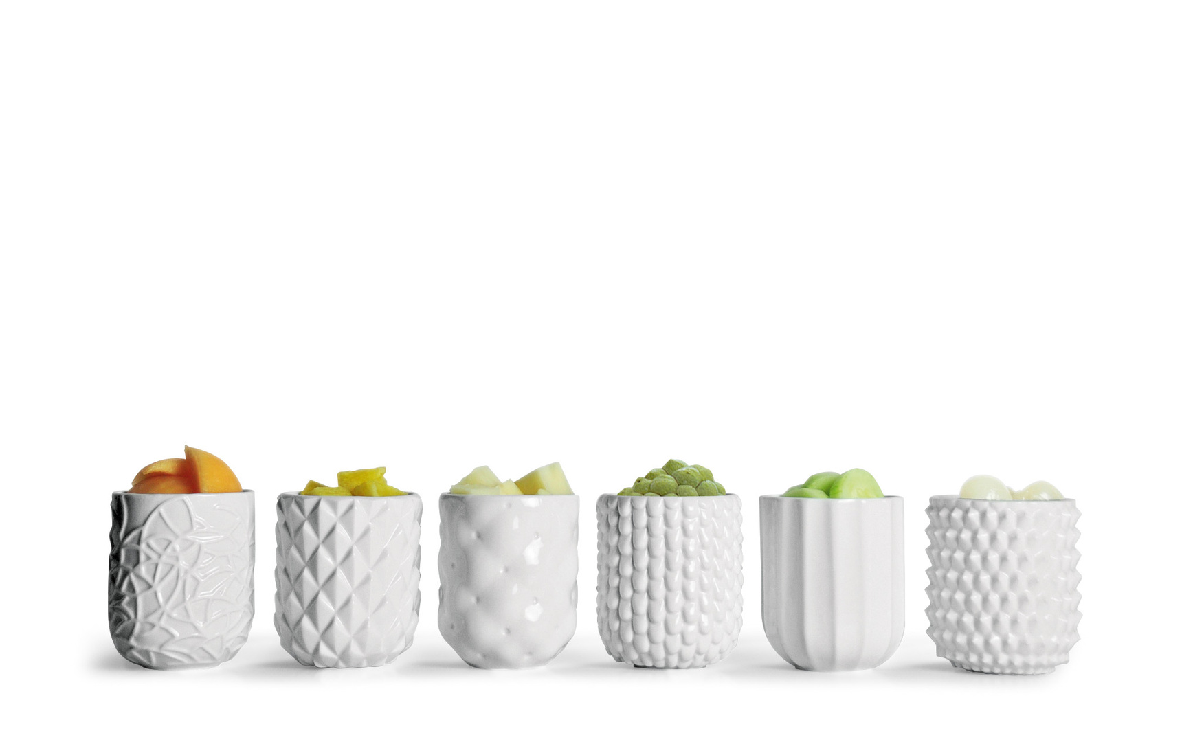 With these ceramic cups the focus is on the haptic experience. The collection consists of six cups with geometric relief patterns on the outside which remind one of various kinds of fruit and vegetables. Holding the cups that way arouses associations which lead to a haptic experience by the feel of the cups, releasing an emotional component. The cups are produced in white ceramic using plaster casting.