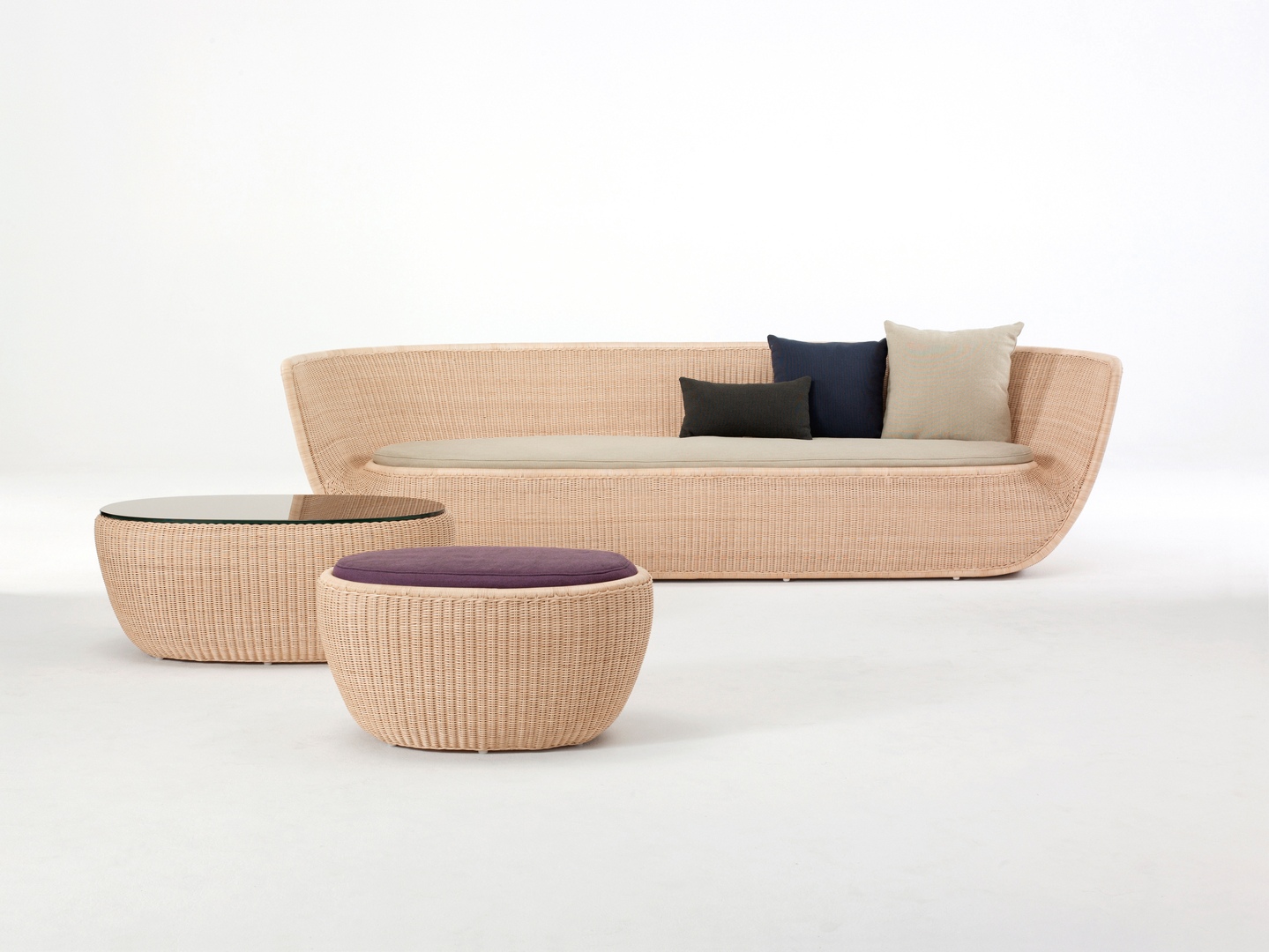 The striking appearance of this sofa is characterised in particular by the dynamic shape of a furrow which accentuates the upholstery on the one hand, but also on the other hand serves as the ideal place to position cushions. The sofa practically invites to arrange cushions in various combinations, just like it’s done with fruit in a bowl. The collection, which also includes a side table and an upholstered stool, is hand-made of rattan or, for outdoor use, of plastic.