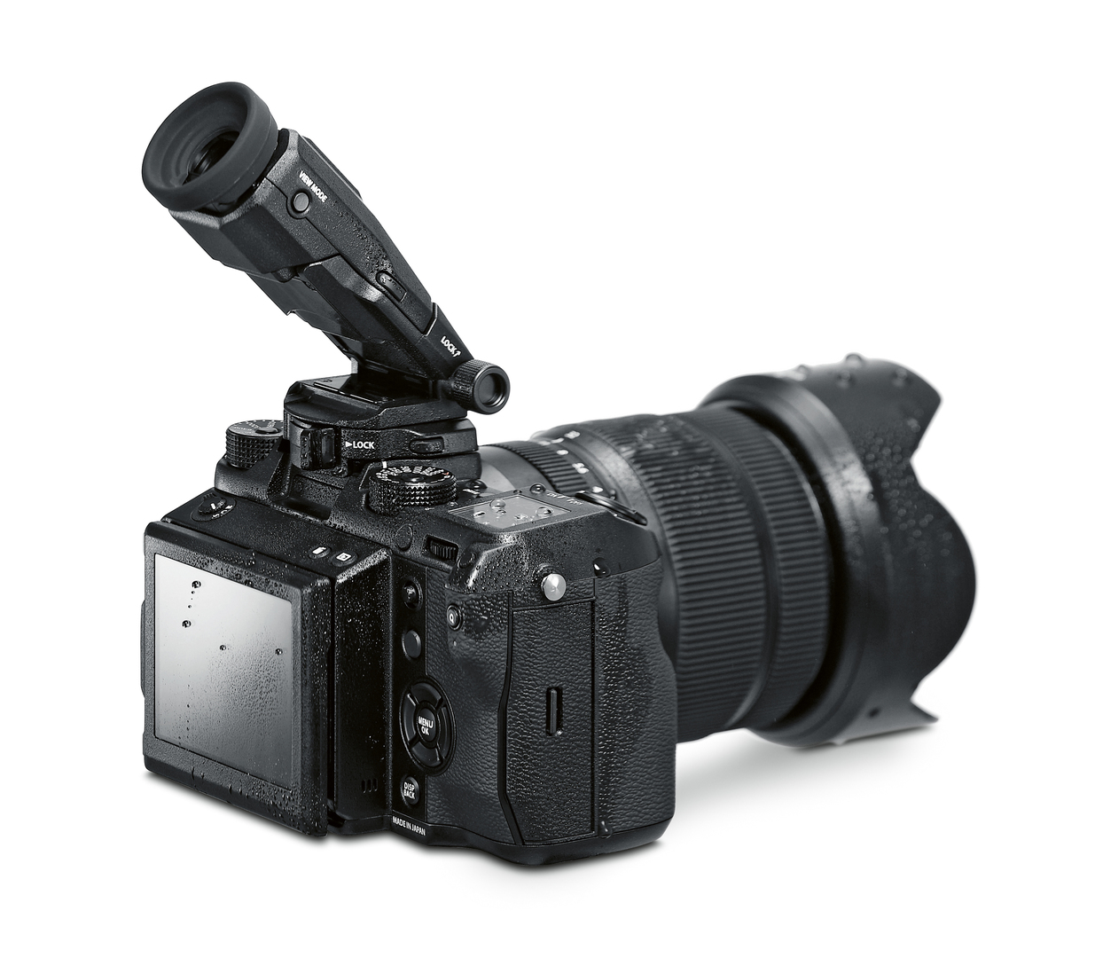 The EVF-TL1 tilt adapter is an accessory for the GFX medium-format camera system by Fuji. The adapter is mounted between camera body and viewfinder so that the latter can be tilted by 45 degrees in both directions on the horizontal axis, and by 90 degrees upwards on the vertical axis. This offers more flexibility when looking through the viewfinder. The plain, high-quality aluminium accessory fits with the GFX housing and is characterised by robustness. The adapter can be locked onto both axes in any position.