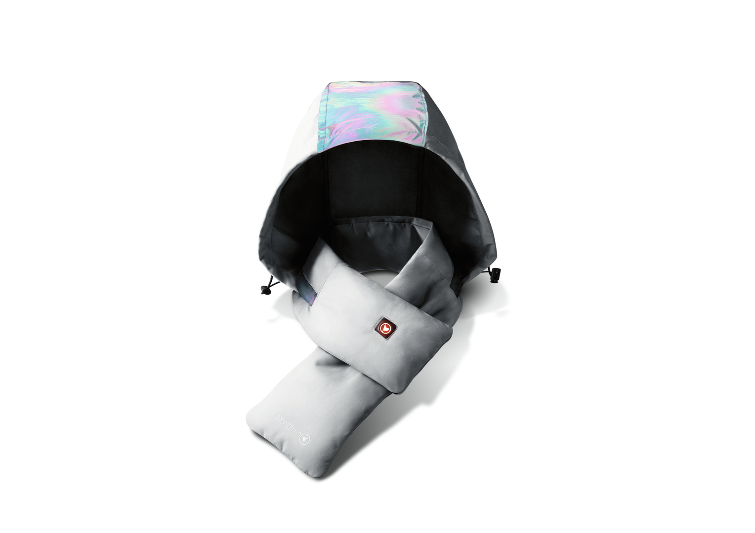 Weighing just 180 grams, the functional heating scarf provides the wearer with soothing warmth thanks to its windproof and water-repellent fabric as well as the integrated and patented Flexwarm technology. The curved neck warmer has three temperature settings that are reached within seconds and can be held for up to six hours thanks to energy-saving technology. The washable scarf is also equipped with a hidden hood to protect against wind and rain.