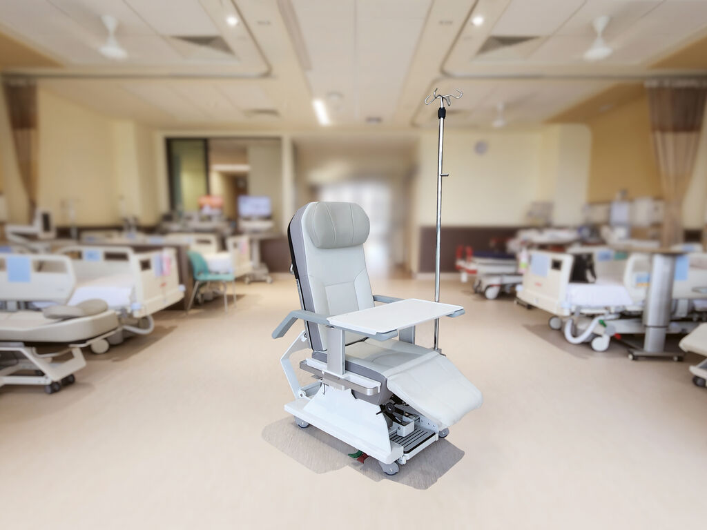 The FUSA Chair is a multifunctional geriatric chair co-developed by healthcare professionals for use in hospitals. It supports patient rehabilitation, facilitates caregiver duties and serves as a patient activity recliner, visitor seating or bed. It offers a 180-degree flat reclining position, adjustable head and calf support and concealed safety functions such as lockable armrests, a non-slip footrest and concealed levers for greater comfort and safety. The robust aluminium frame can support up to 300 kg, while the easy-care medical-grade materials meet clinical standards.