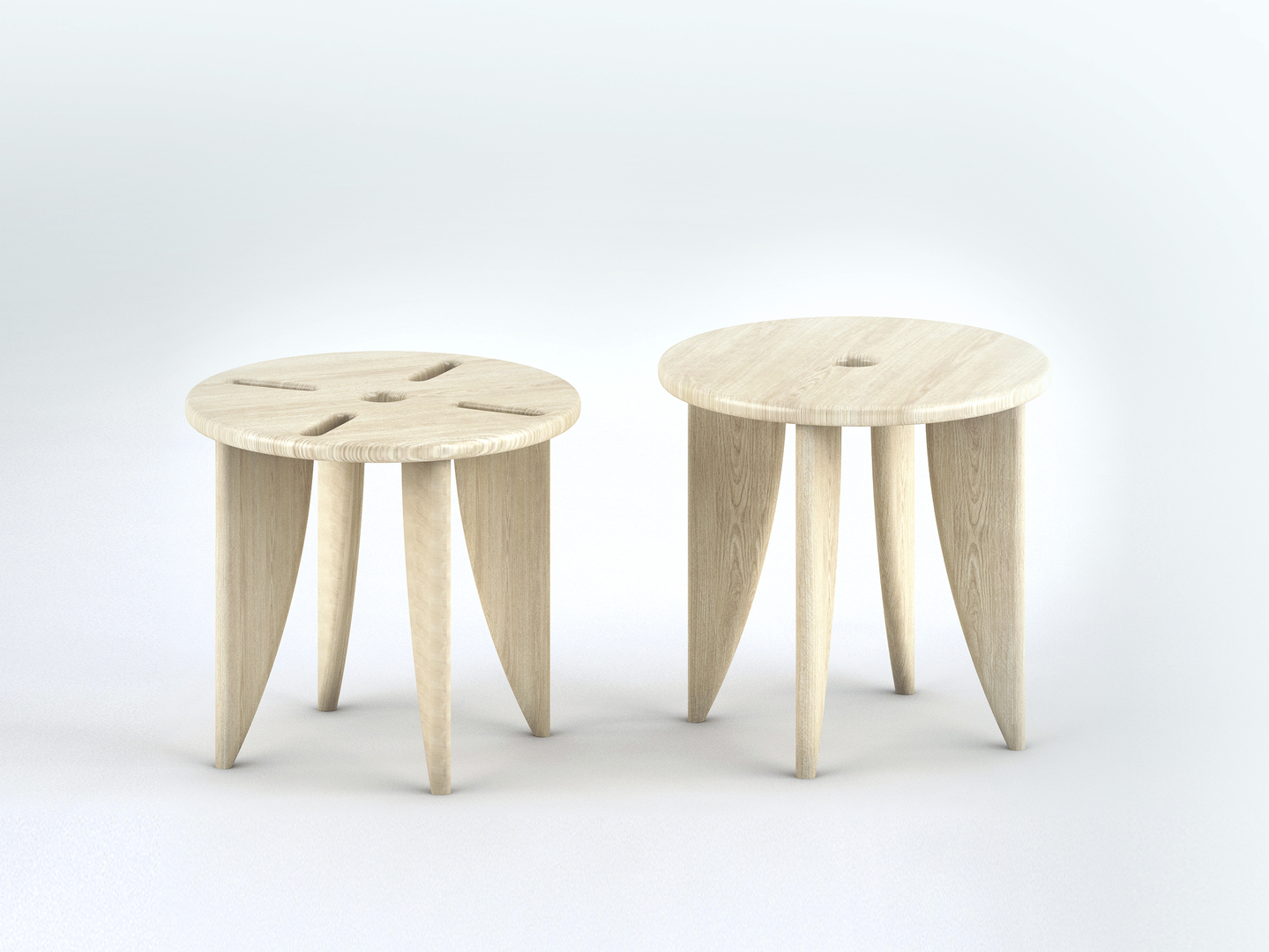 Inspired by nomadic usable seating furniture, two similar stools differ in small features that allow them to combine perfectly. The lower stool has four more groves on the solid top than the taller stool. Once stacked, both stools lock precisely in place because of the grooves. Both stools have a unifying hole in the centre that allows one to easily handle both stools at once. All structural components are made of solid wood that is protected with an oil sealant. The stools can also serve as coffee tables, thus providing multiple permutations of use. Red Dot Award: Design Concept | Concept | Furniture