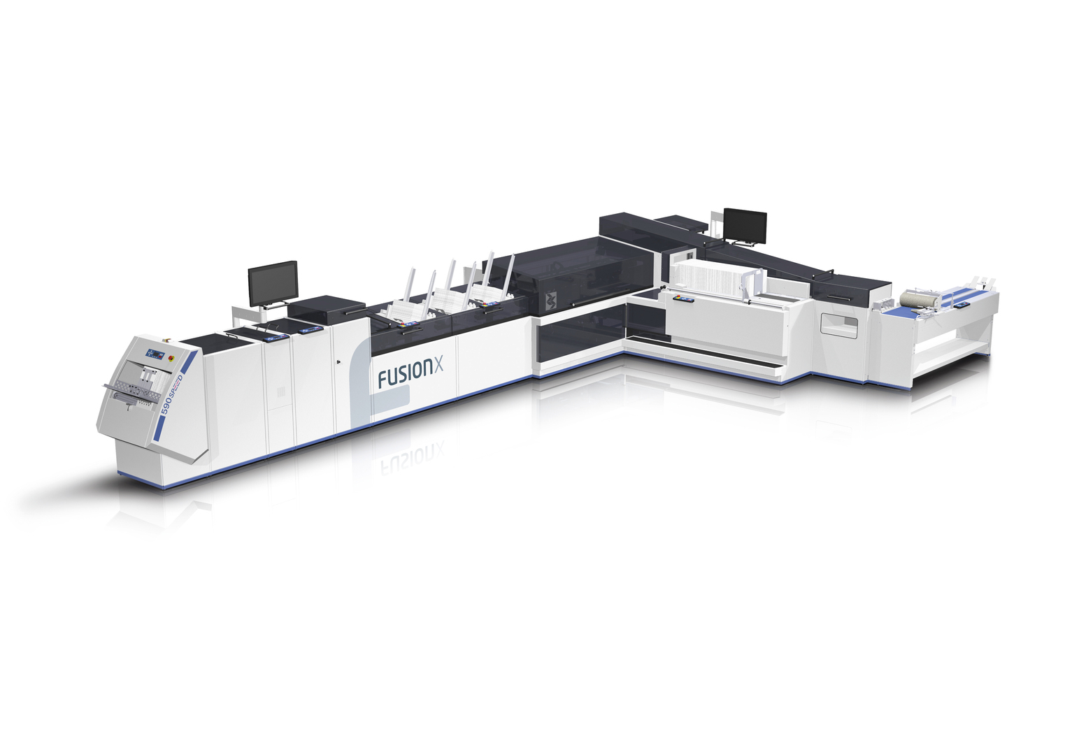 This high-performance inserting system for up to 22,000 multi-part letters per hour is characterised by a reduced design of cubic housing volumes and clear lines. The 7-degree inclination of the closing lane indicates the direction of the process and provides users optimal insight into the process along with easy access to the individual stations. An innovative positioning control via touchscreen monitors additionally supports user guidance.