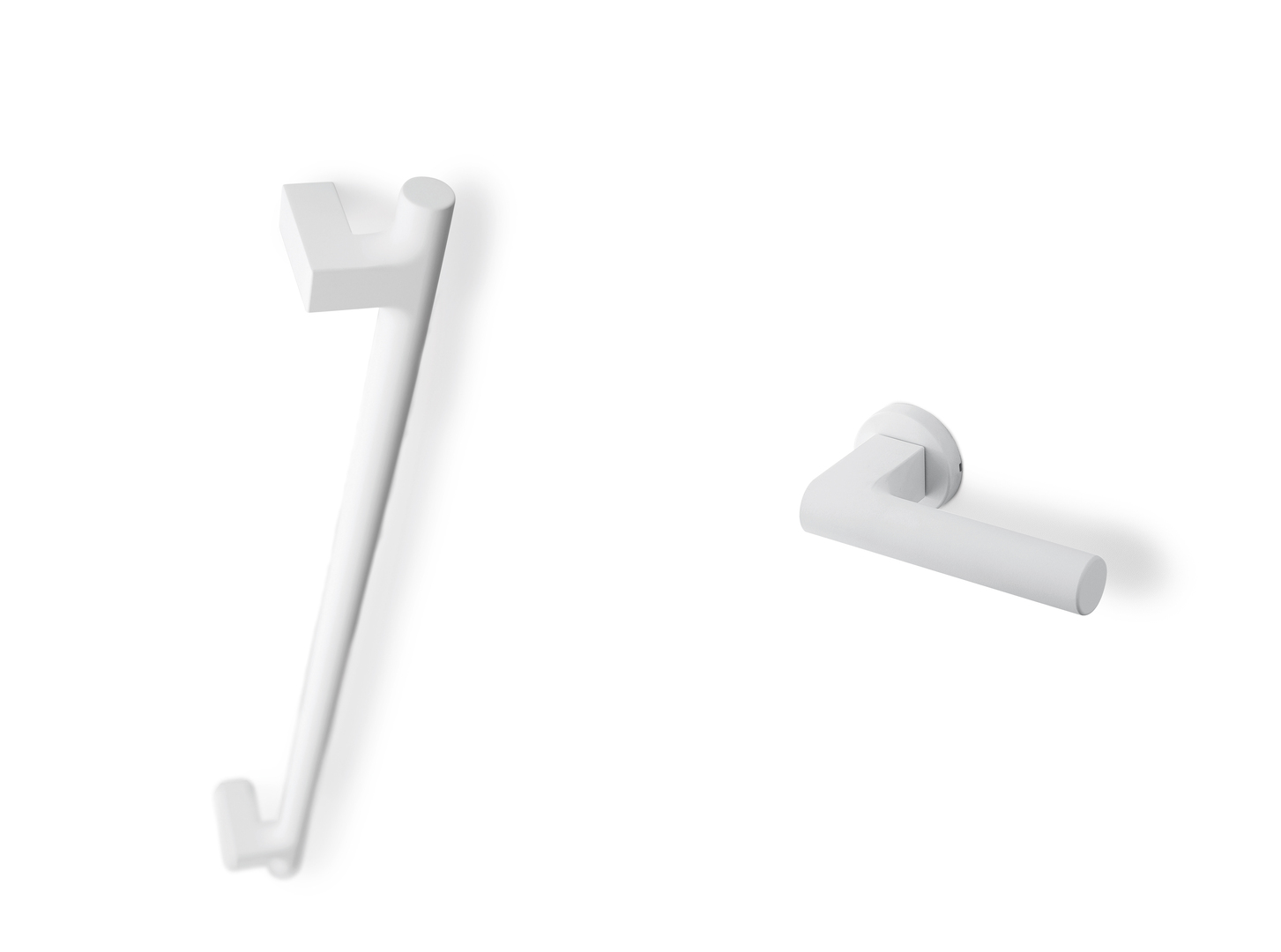 The design concept of this door handle and lever handle is based on the principle of “harmony”. The product is painted white to make them harmonise with a white background. Angular parts are blended seamlessly with the rounded contours thus ensuring a comfortable grip. In addition, the design gives the product its shape and depth, creating different impressions depending on lighting conditions.
