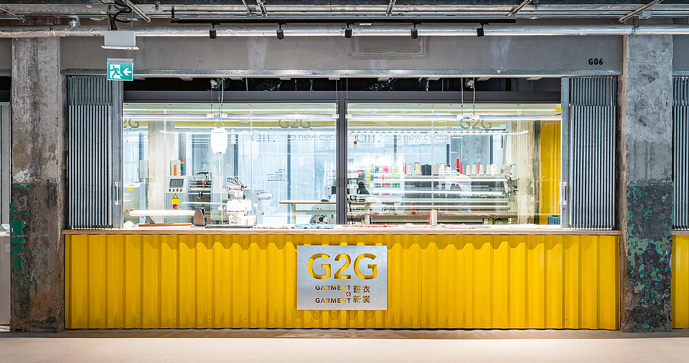 This retail interior combines a sales room with a production site. The G2G shop allows customers to see how new clothes are made from old ones in a glassed-in area framed by container elements. The double-glazing shields the retail space from noise and simultaneously ensures good visibility of the production process. The design pays tribute to both old and new building elements, for example by using traditional metal gates to flank the shopfront. Pillars inside have been left untouched to reflect the design philosophy “old is old, new is new”.