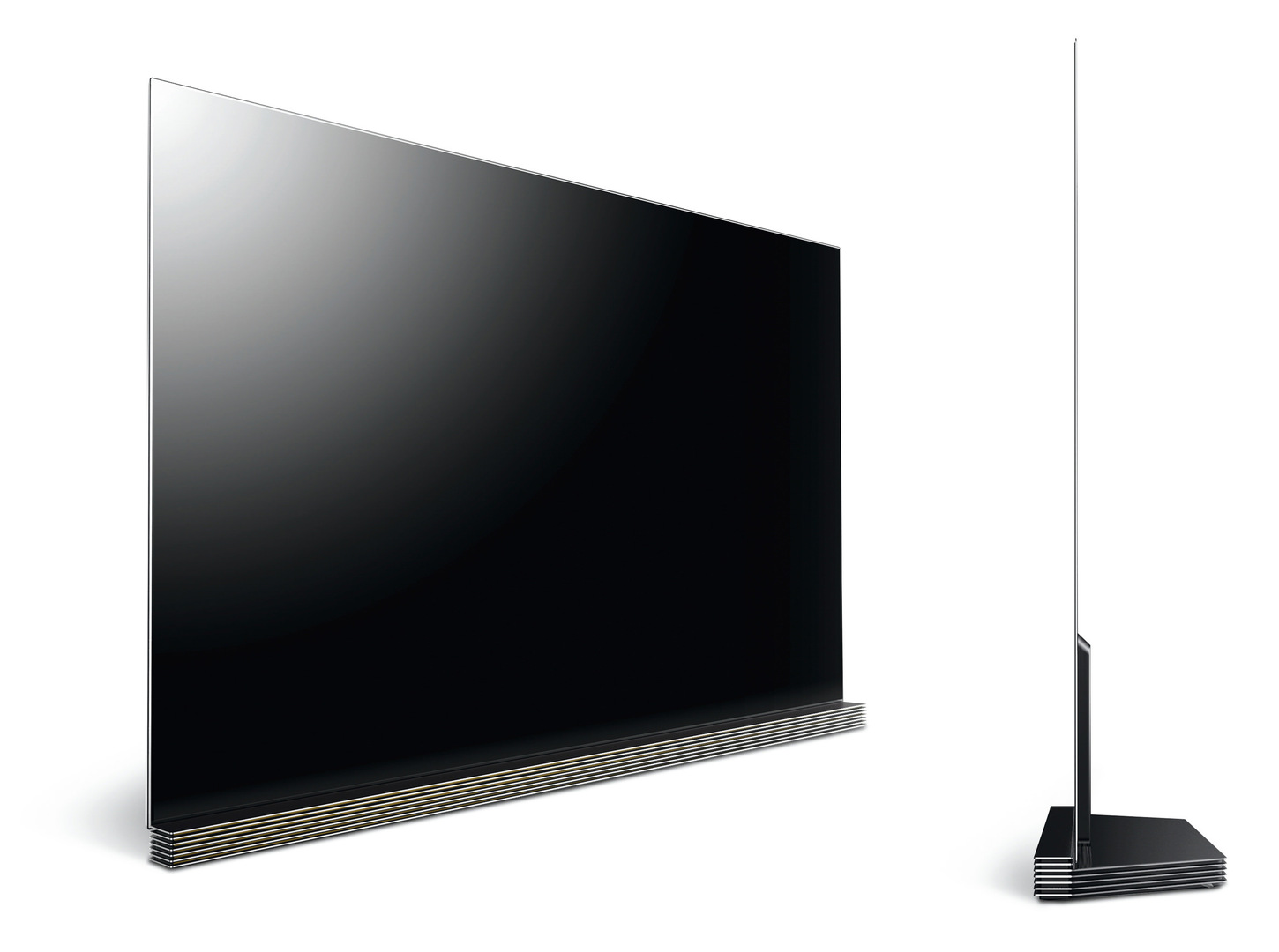 This OLED TV is extremely slim due to clever placement of various component parts in the stand. The riffle of the stand hints at its function as a speaker.