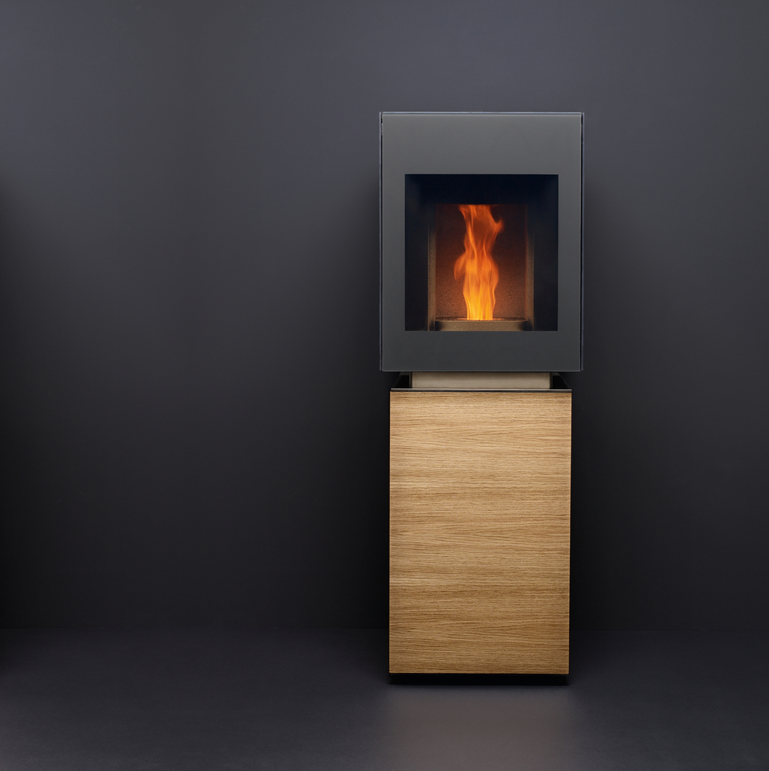 The Gabaan fireplace heater is a new way of experiencing an indoor fire which provides constant heat and is elegant to look at. A noticeable feature is its appealing and constant flame which is adjustable to exactly the level you want, thanks to the specially developed pellet-supply system. Just push a button to light or extinguish the fire. The stove also has a rotatable combustion chamber with large windows. This is set in a glass cube in grey or black which sits on an attractive base containing the hidden control equipment and pellet container.