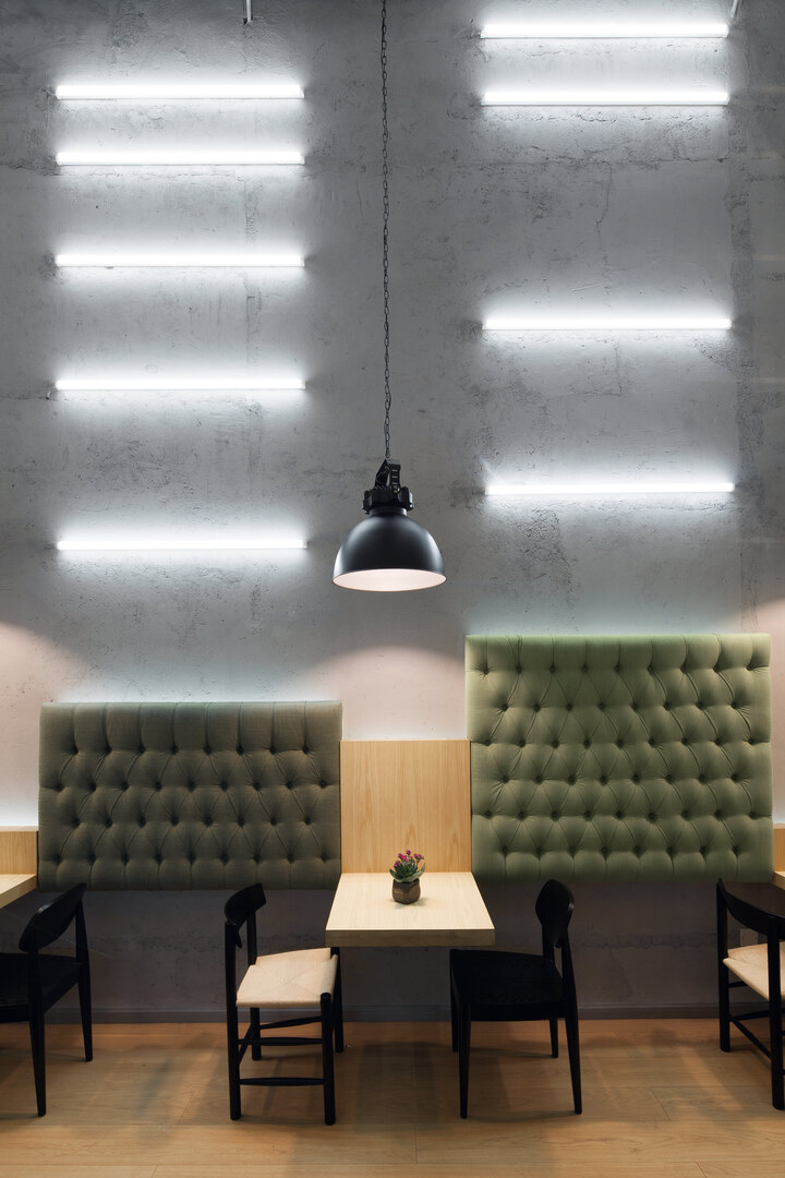 The design of this casual eatery at Wongtee Plaza in Shenzhen, China, adopts a similar sense of style as previous GAGA café designs, yet with enhanced appearance and geometric boldness. The aim was to create an environment that satiated both the energetic lifestyle of its patrons and the café’s delicate food. As the space has been designed across multiple levels, the walls, floor and ceiling showcase individual characteristics and offer an interesting play between lighting and furnishings. For example, the wooden drop ceiling running across parts of the café transforms into a metal mesh frame that supports hanging planters and even a sculptural lighting structure.