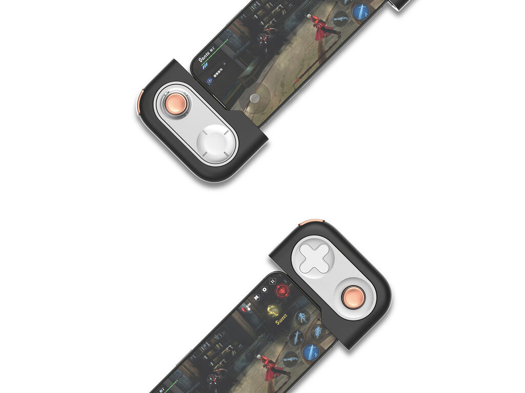 This portable Gamepad can be used with a range of smartphones thanks to its modular construction. A pivot lock mechanism securely attaches both sections vertically and horizontally to the phone. An interface for connecting a VR headset ensures an immersive gaming experience while intelligent control elements accurately capture inputs. The compact Gamepad furthermore enables game output. The button layout is ergonomic, and a rose gold decorative element underscores the premium nature of the device.