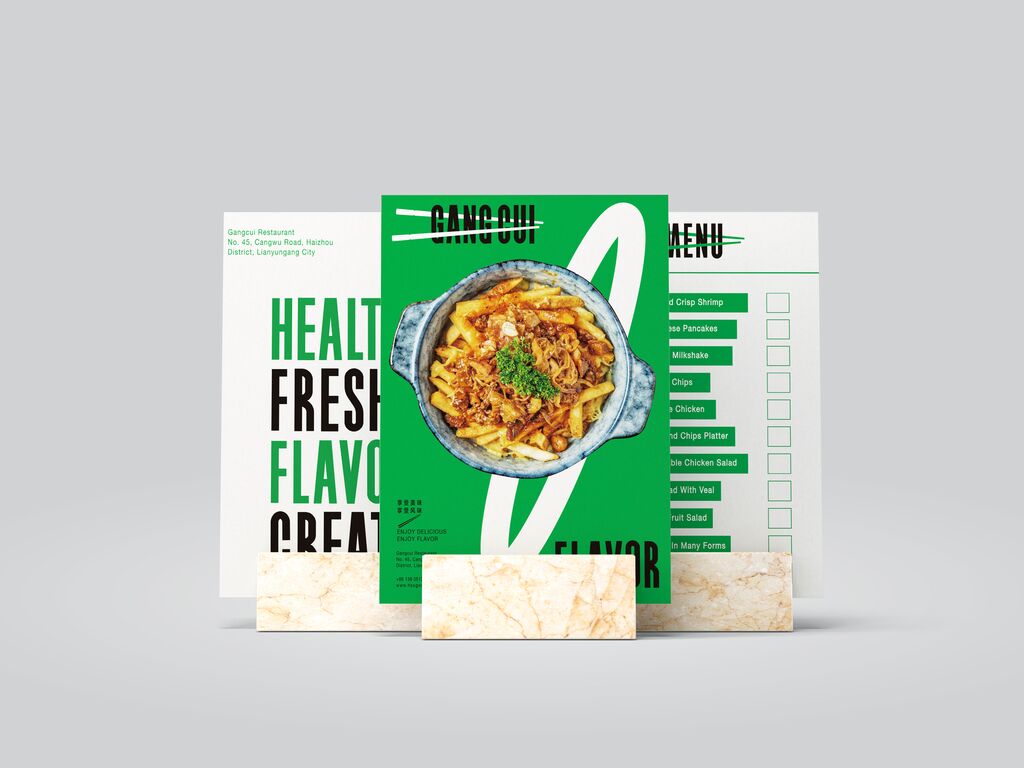 Gangcui is a restaurant fusing Hong Kong and South-East Asian style with Chinese dining habits. The brand design’s key visual are chopsticks arranged in different positions to interact with individual words: the chopsticks can, for example, enclose the word mark or a single letter to draw attention to advertising messages such as “health” or “flavour”. The chopstick design varies, using the brand colours green, white and black to build a recurring aesthetic appeal in every scene. At the same time, the key visual creates a distinctive overall image.