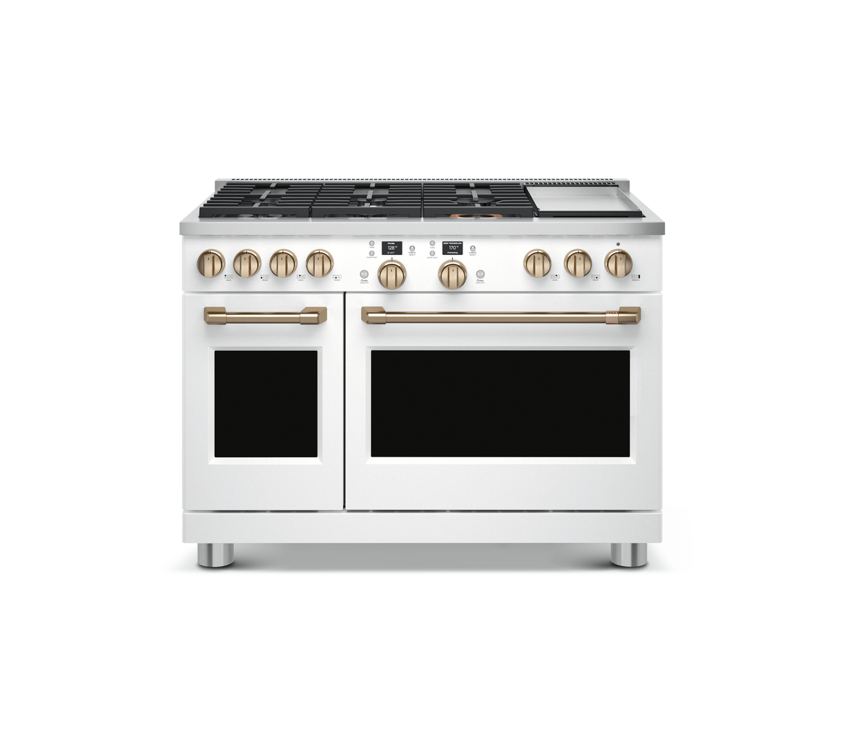 The GEA 48" Café Pro Range cooker exudes a high-quality and stylish overall impression. This is achieved by a skilful combination of materials and colours: white surfaces meet finishes and control elements in shades of copper and champagne gold. The appearance is completed by black-coloured pot rests and interiors, as well as a grill surface of brushed stainless steel. The large capacity of the oven along with the powerful burners conveys a functional quality that makes for a professional cooker.