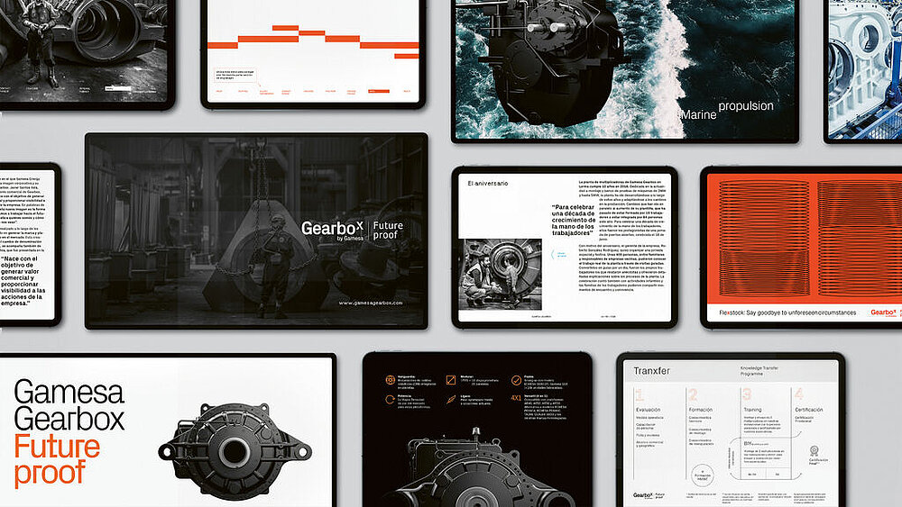 As an industrial unit within Siemens Gamesa, Gearbox produces gear solutions for wind turbines. The aim was to re-imagine the brand concept in a way that was true to its industrial heritage, while renewing the company’s positioning as a manufacturer of clean energy. The challenge was to translate the positioning into a visual identity and to build a wider set of elements – a design system that was overall simpler to work with. Taking the world of gears and their function within drives as a reference point, a simple yet powerful design concept was developed. The choice of contrasting colours increases the brand identity’s recognition value.