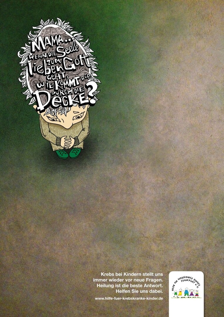 This print campaign demonstrates how the illness cancer features in the mindset of children, illustrating how children suffering from cancer are affected by a disease without morale or conscience – the inevitability of death collides with their naiveté. The intention is to let viewers of the posters experience the perspective of the children and relive the injustice, viciousness and brutality of cancer. The purpose of the campaign was to evoke real emotions which encourage people to help.